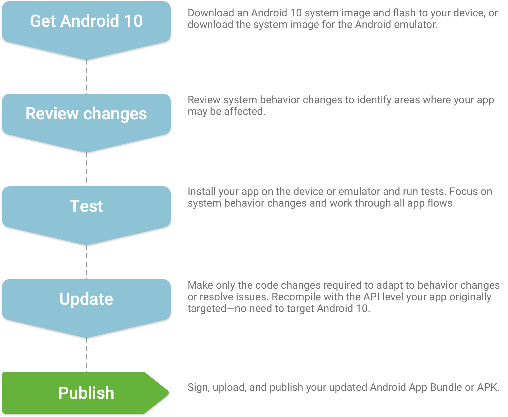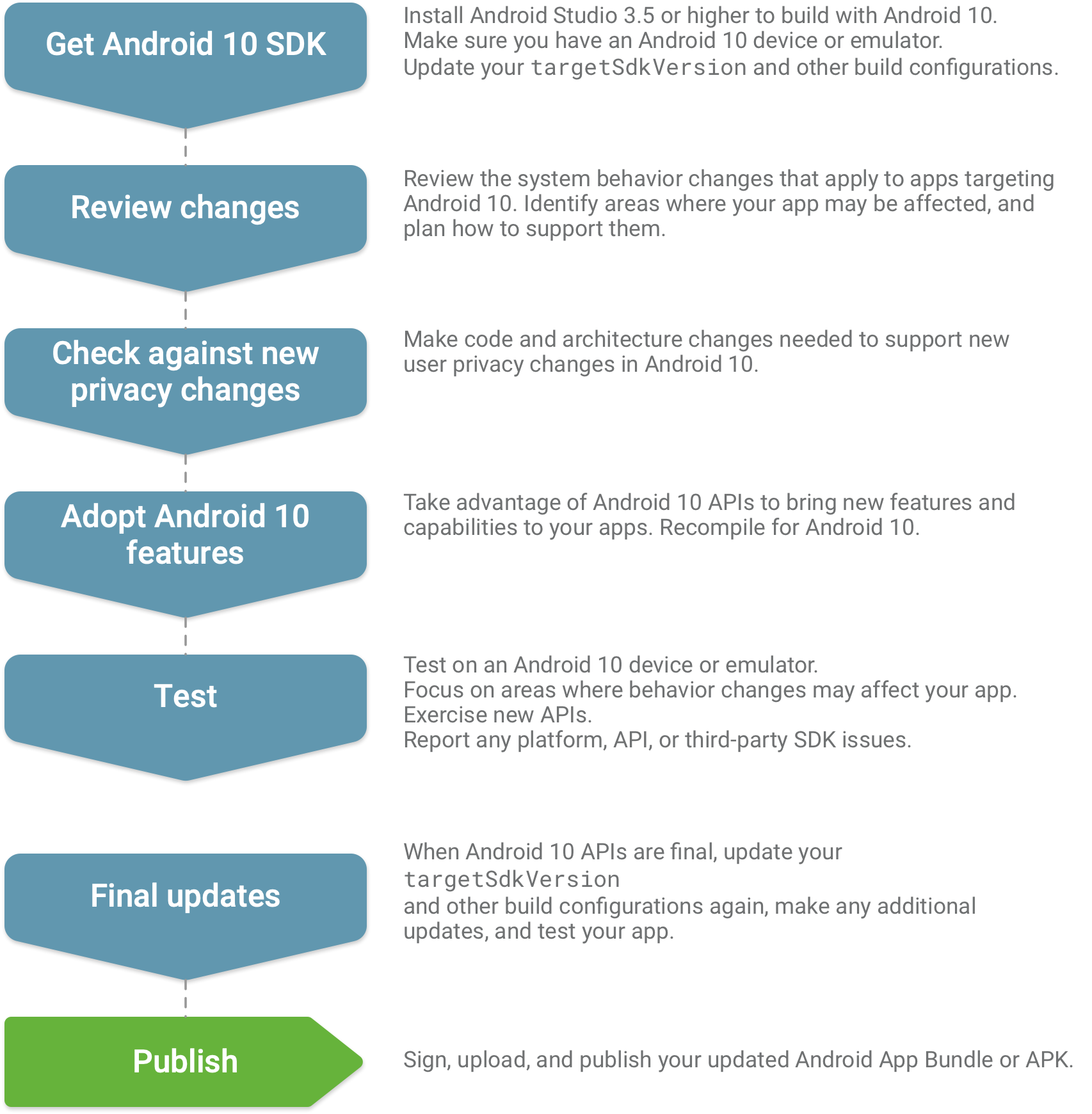 To give your users a smooth transition to Android 10, we recommend publishing a compatible version of your app as early as possible — ideally before devices begin receiving Android 10 updates.