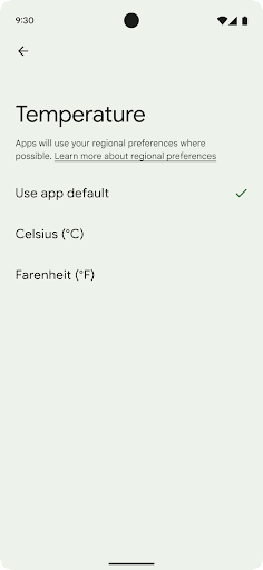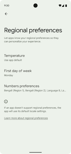 New Android Settings menus for these preferences provide users with a discoverable and centralized location to change app preferences. These preferences also persist through backup and restore. Several APIs and intents—such as getTemperatureUnit and getFirstDayOfWeek— grant your app read access to user preferences, so your app can adjust how it displays information. You can also register a BroadcastReceiver on ACTION_LOCALE_CHANGED to handle locale configuration changes when regional preferences change.
