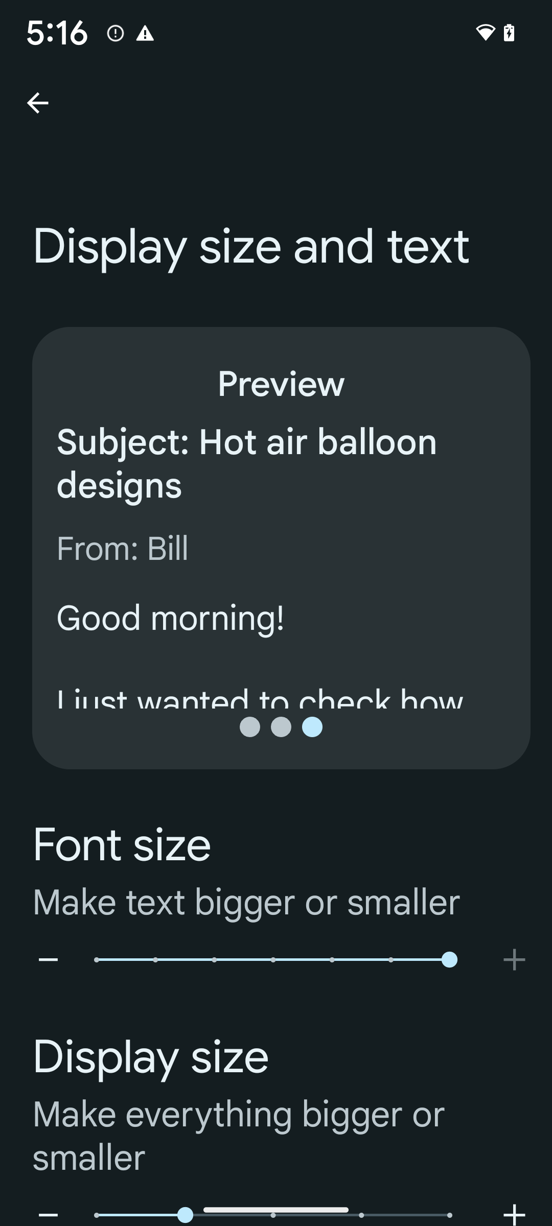 2. For the Font size option, tap the plus (+) icon until the maximum font size setting is enabled, as shown in the image that accompanies this section.