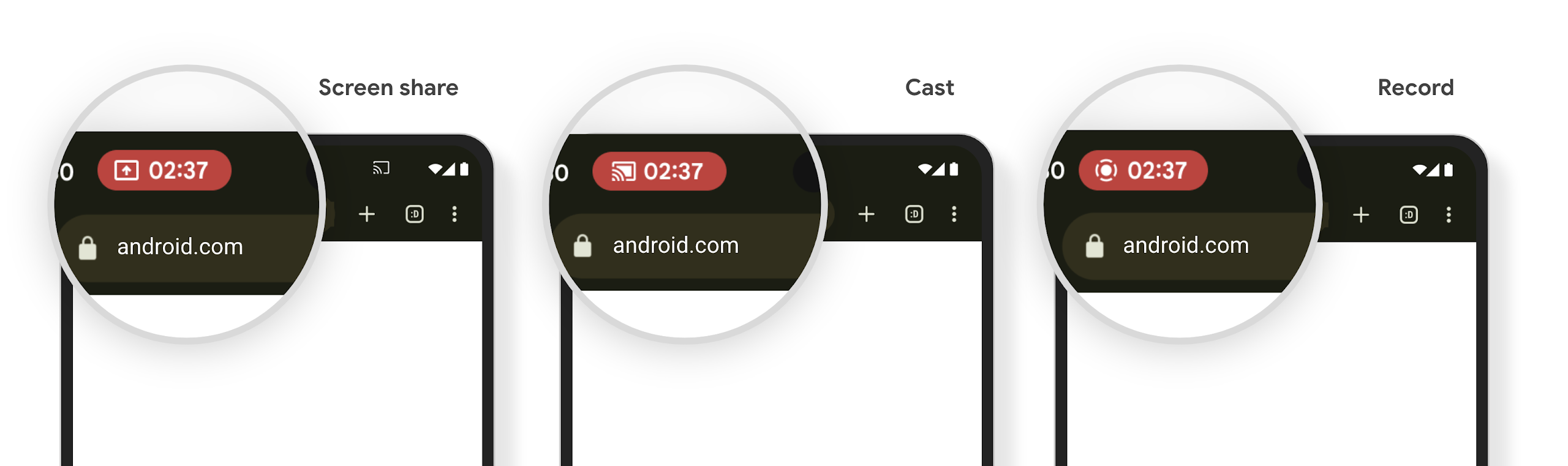 Media projection can expose private user information. A new, prominent status bar chip makes users aware of any ongoing screen projection. Users can tap the chip to stop screen casting, sharing, or recording. Also, for a more intuitive user experience, any in‑progress screen projection now automatically stops when the device screen is locked.