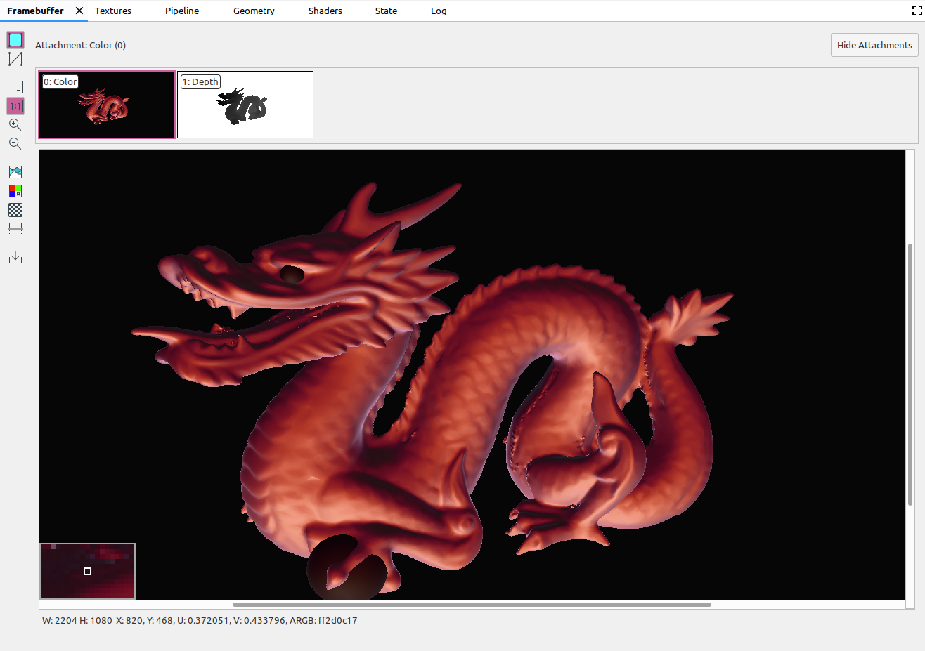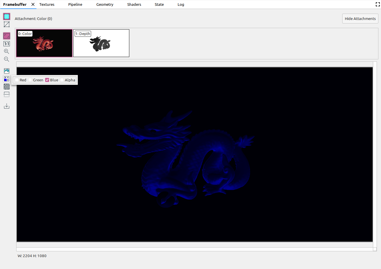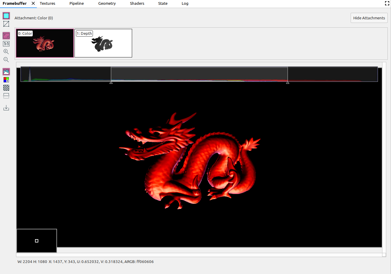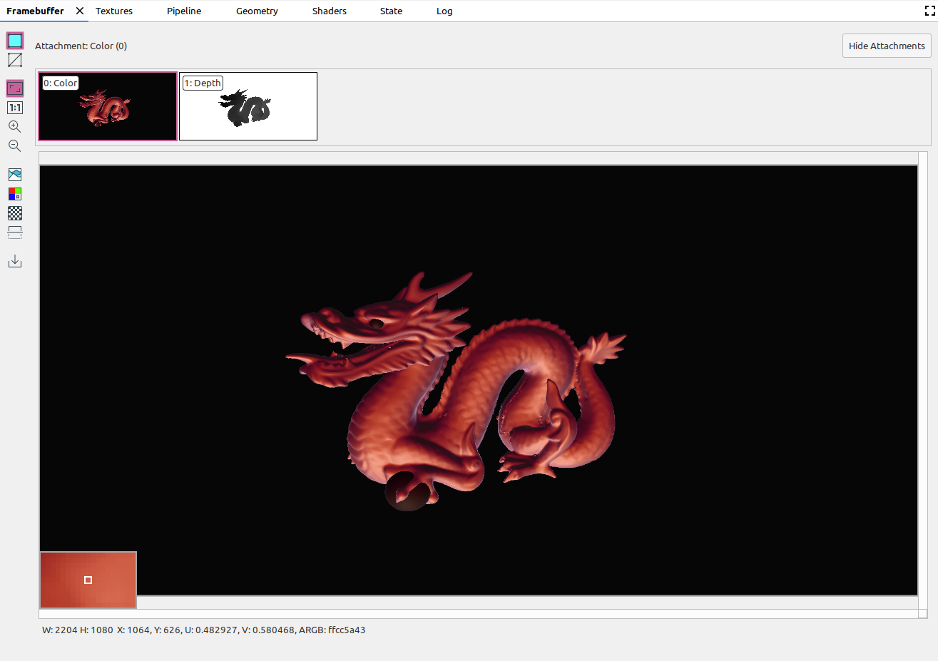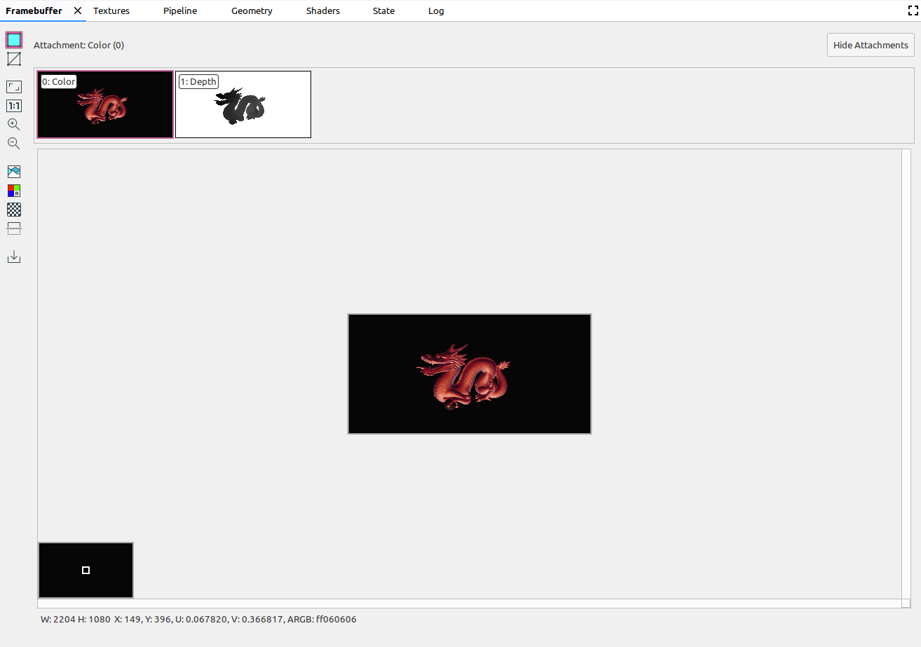 A framebuffer can contain multiple attachments. You can select which attachment to display and click Show Attachments or Hide Attachments as needed. Attachment thumbnails are labeled with the type of the attachment (for example, COLOR, DEPTH, and INPUT) as well as its index.