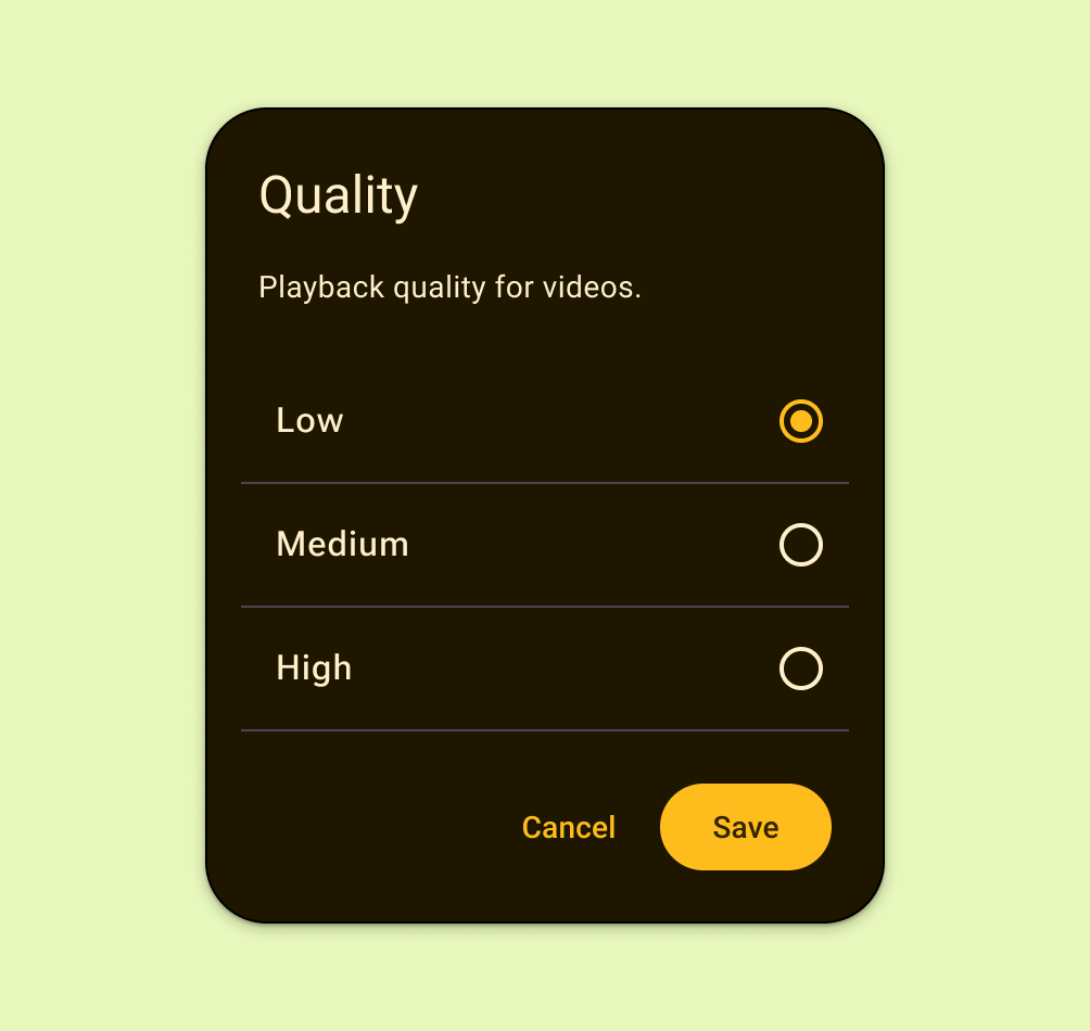 Provide additional or alternative personalization options to enhance your user's experience, but don't replicate or replace settings provided by the system. For example, your app may extend the theming system for greater personalization or give more granular sound controls.