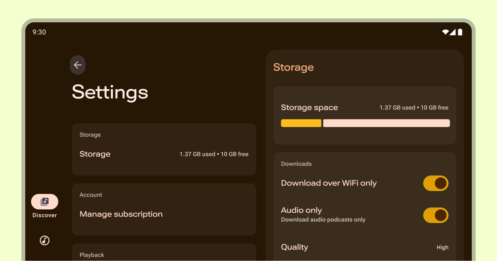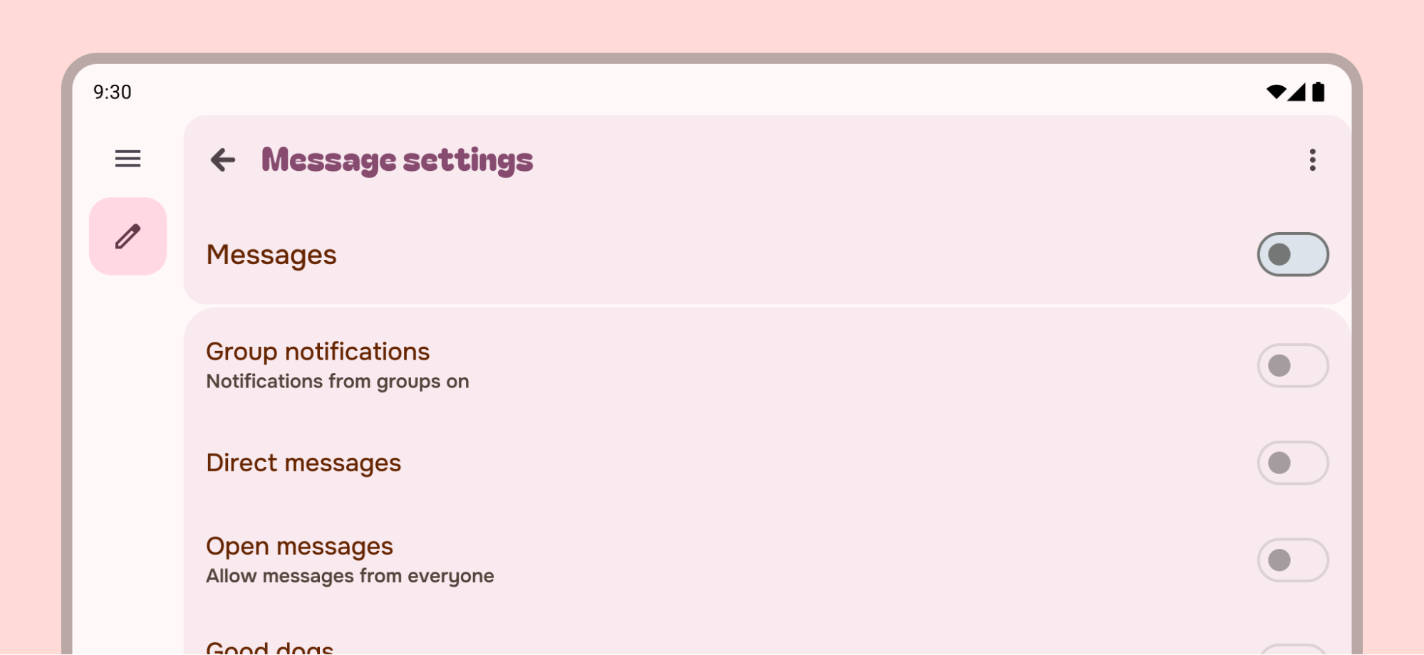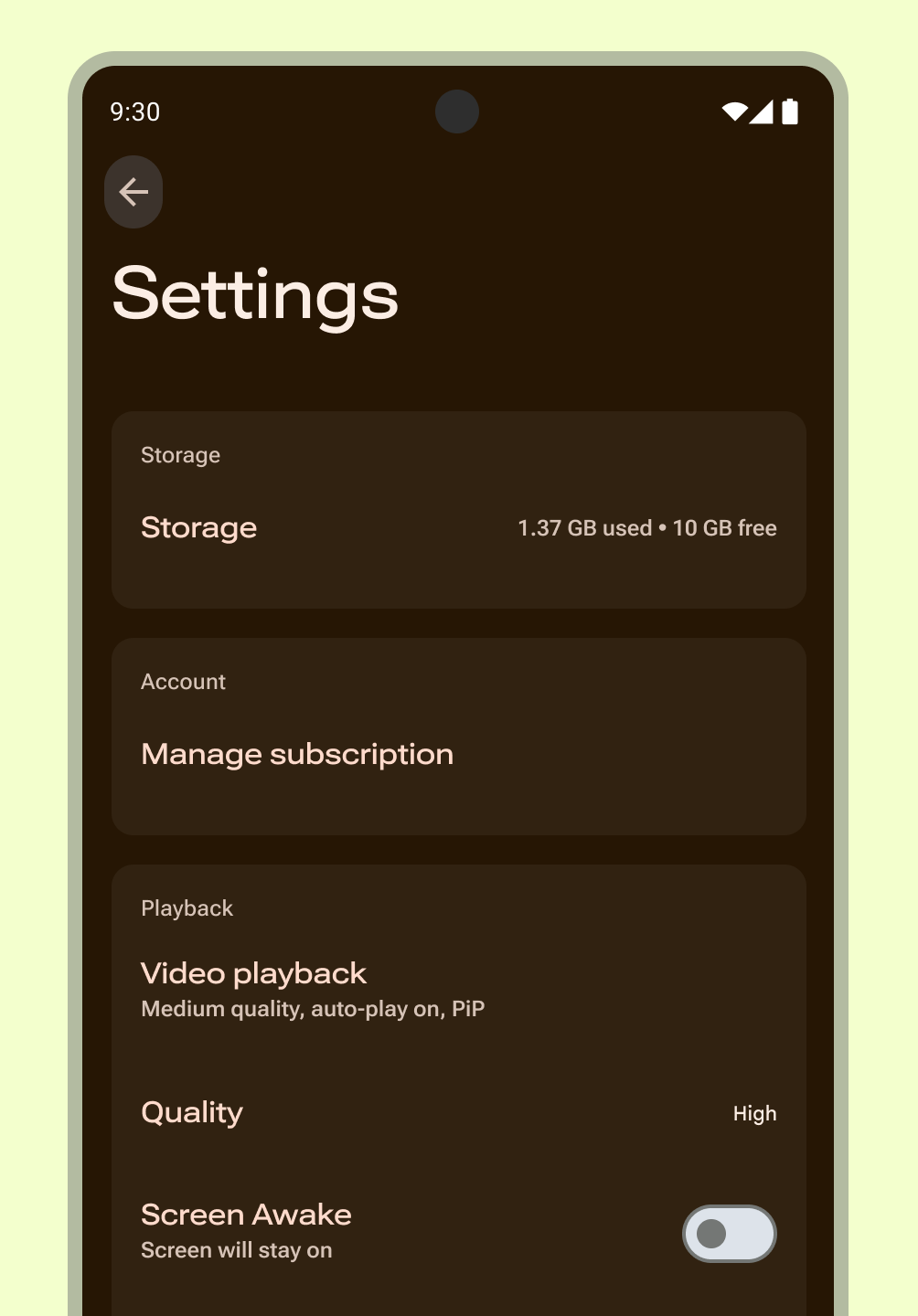 Users can quickly see the most important and frequently used settings and their values. Create an overview page using a list layout. Use Material Design components to provide a cohesive experience. If necessary, create a separate screen in your app for destinations such as account, app info, help, and feedback.