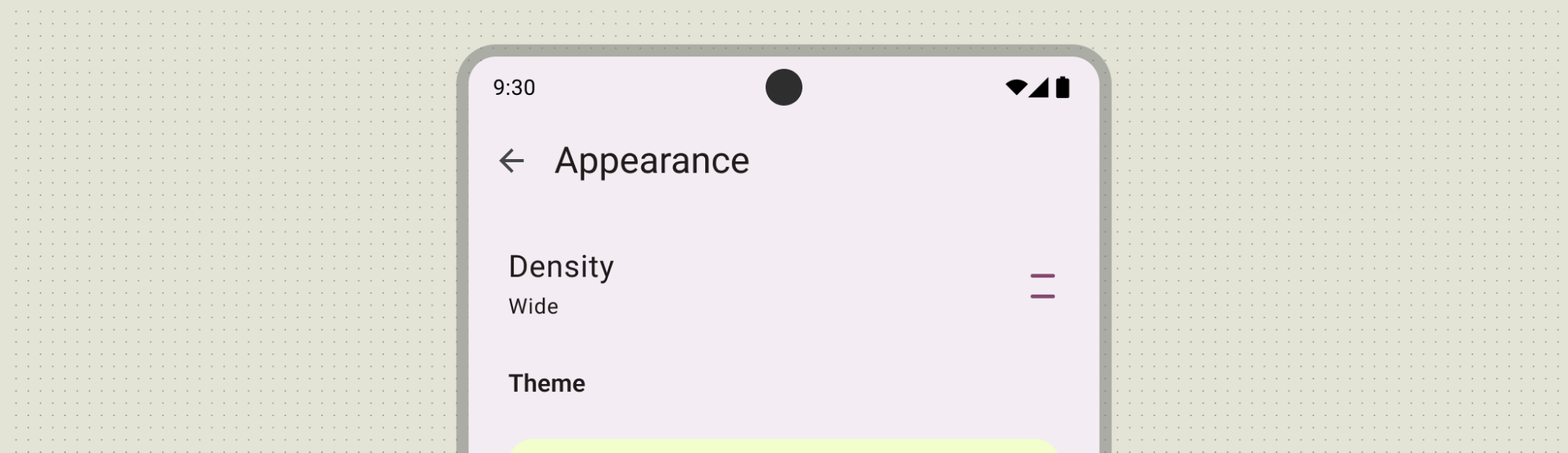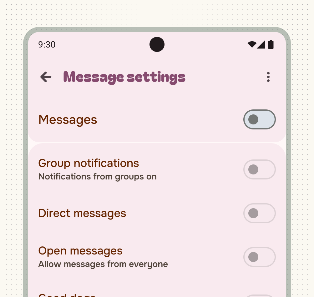 Using list-detail canonical layout lets you quickly adapt your settings screens to larger screens. Think about each screen as a containment pane to make adapting seamless.