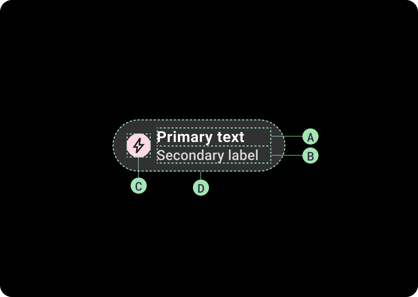 Chips can contain up to two text labels and an optional icon. At least one text label or an icon must be provided. Chips may truncate text if the text label is too long. The primary label is one line of text if the secondary label is present. The primary label can contain two lines of text if the secondary label is not present.