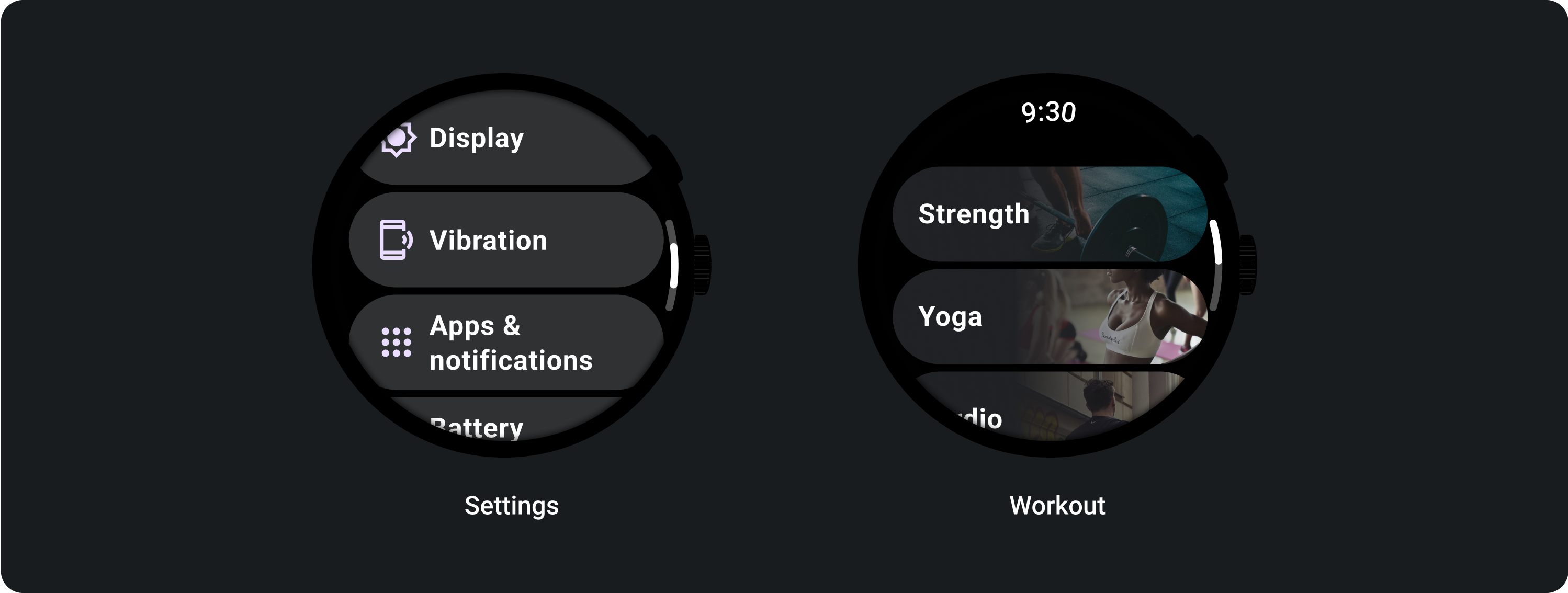 See examples of chip usage such as standard chips in Settings and image chips in an exercise app.