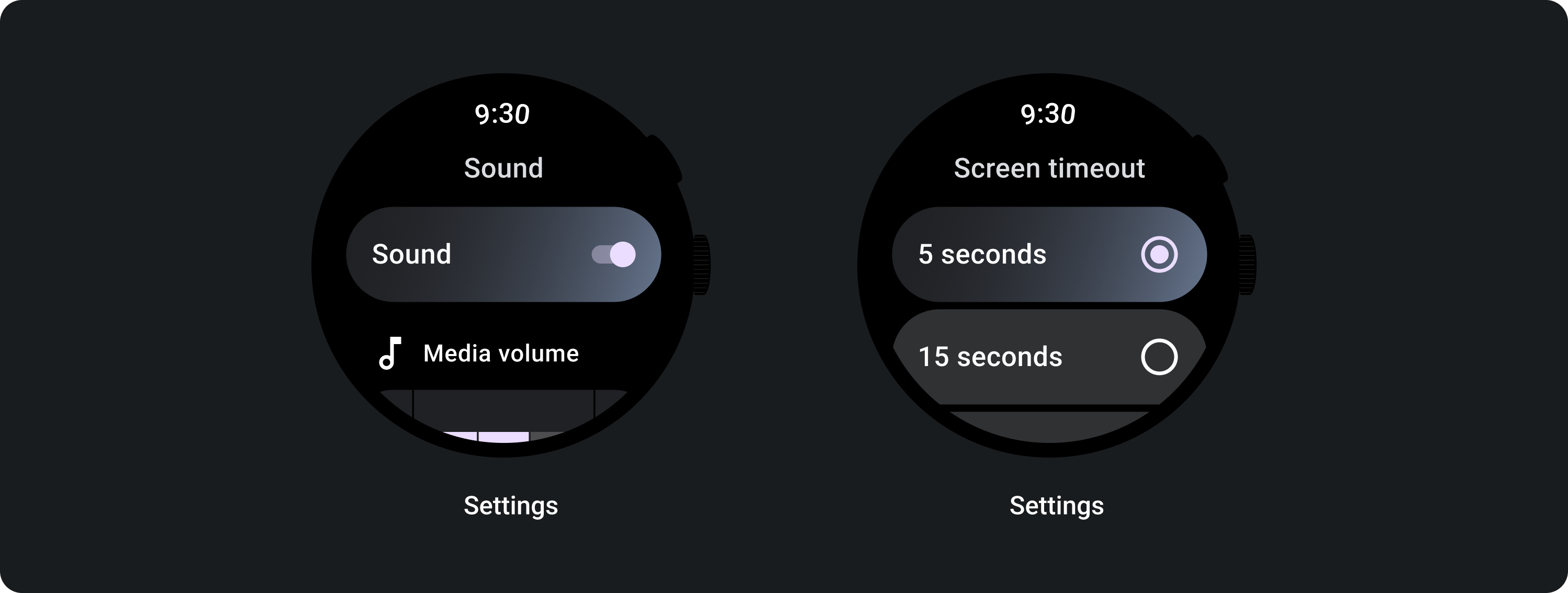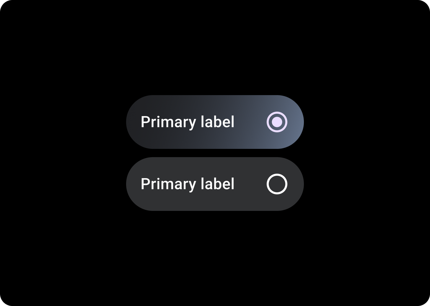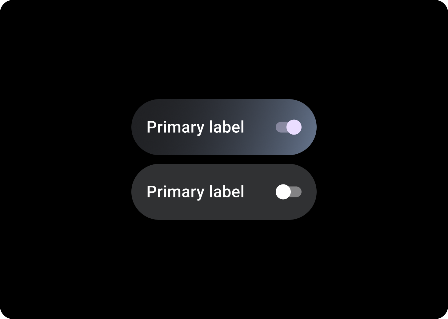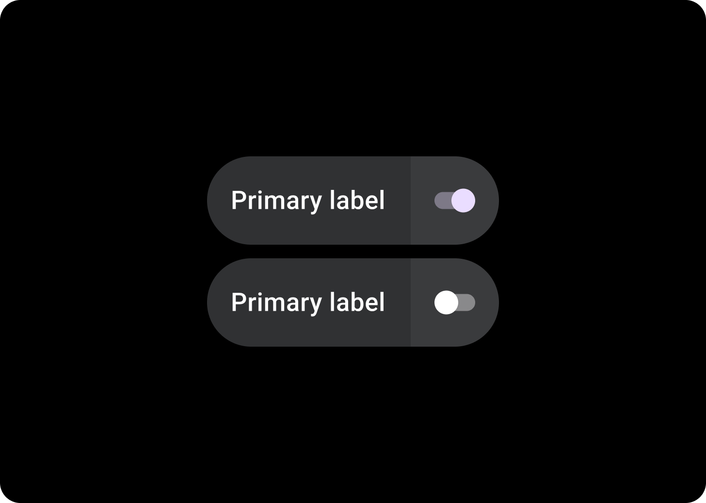 Toggle chips include a bi-state toggle control. Some examples of a bi-state toggle control include a switch, radio button, or checkbox. Use toggle chips for situations in which many options may need to be quickly and easily set, such as in Settings.