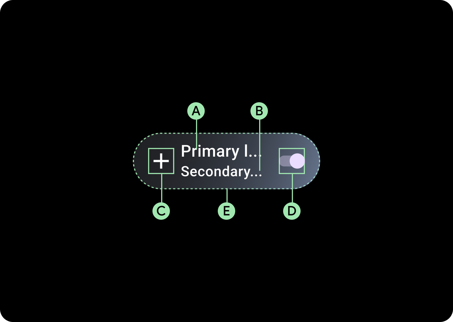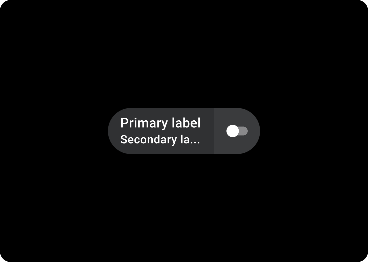 Toggle chips have four slots that accommodate two text labels, one selection control and one application icon. The icon and secondary label are optional.
