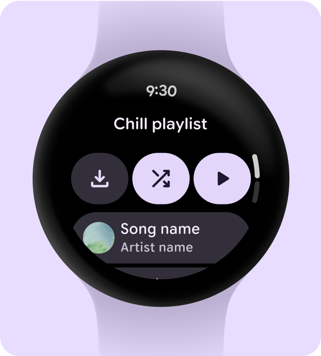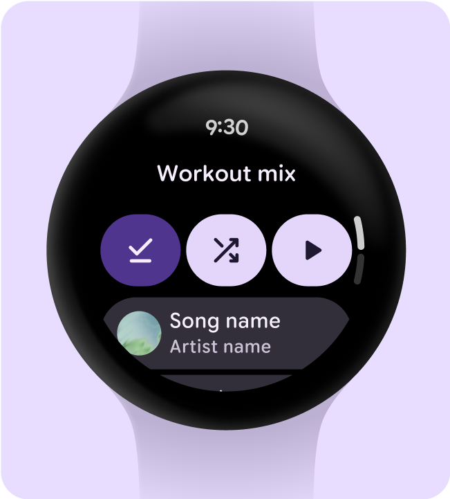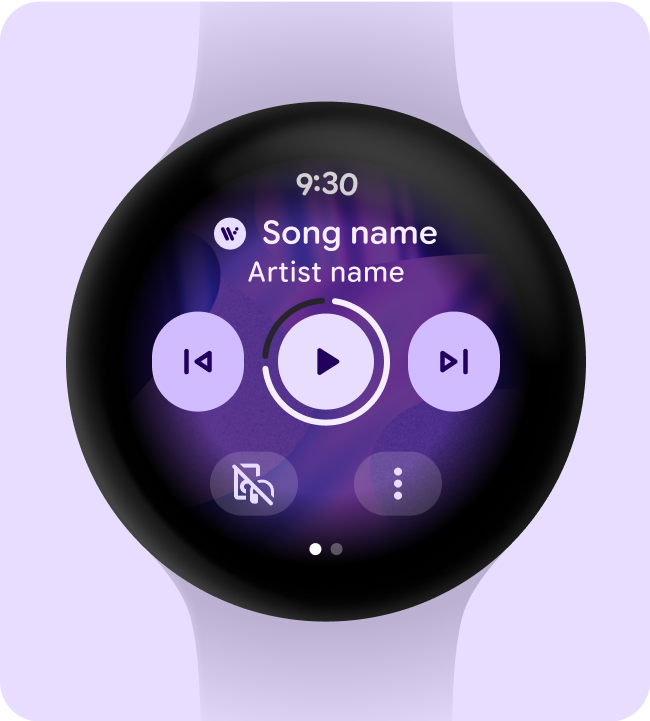 If the source device is the watch, prompt users to select audio output before they start listening to music. After the user selects an output device, play the media and display the output device icon—such as a headset or buds—on the media controls.