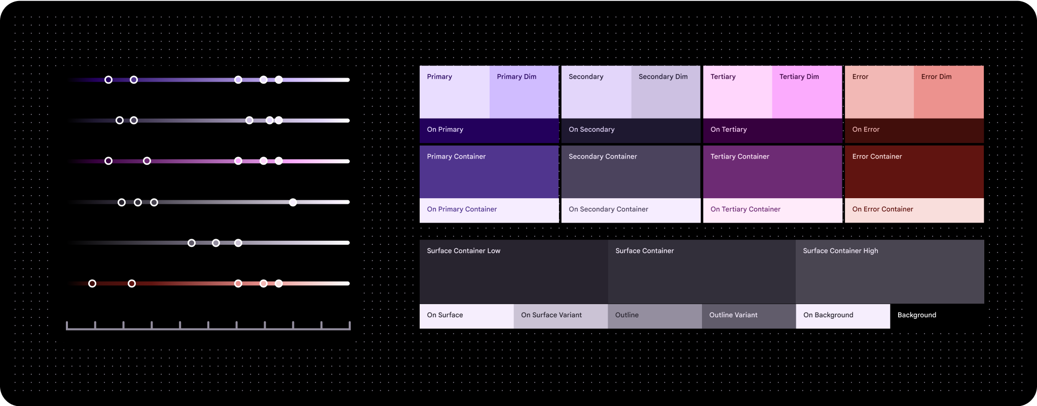 These seeds are put through an algorithm that becomes five tonal ranges, specific tones (based on luminance) are slotted into the predefined roles that consist of a scheme. Colors are mapped to a scheme through design tokens.