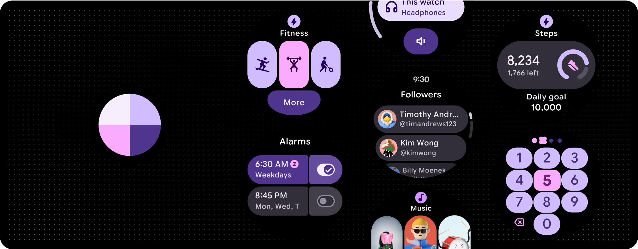 Similar to the way Material 3 Expressive treats color roles, Wear OS applies color to individualized experiences with dynamic and accessible color expression. Wear OS uses only the dark theme because the wearable interface is built on a black background. Being a platform that runs on touch devices, Wear OS also has a more limited color palette as it doesn't require as many hover and focus states. Use the Wear OS-specific color theme building tools to build a custom theme around your brand and generate the full reference palettes and assigned color roles that support Material Design tokens and are built to work seamlessly with system UI components.