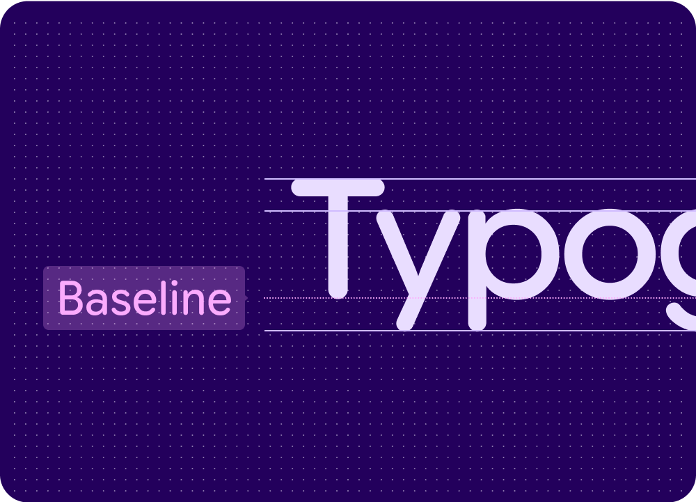 The baseline is the invisible line upon which a line of text rests. In Material Design, the baseline is an important specification in measuring the vertical distance between text and an element.