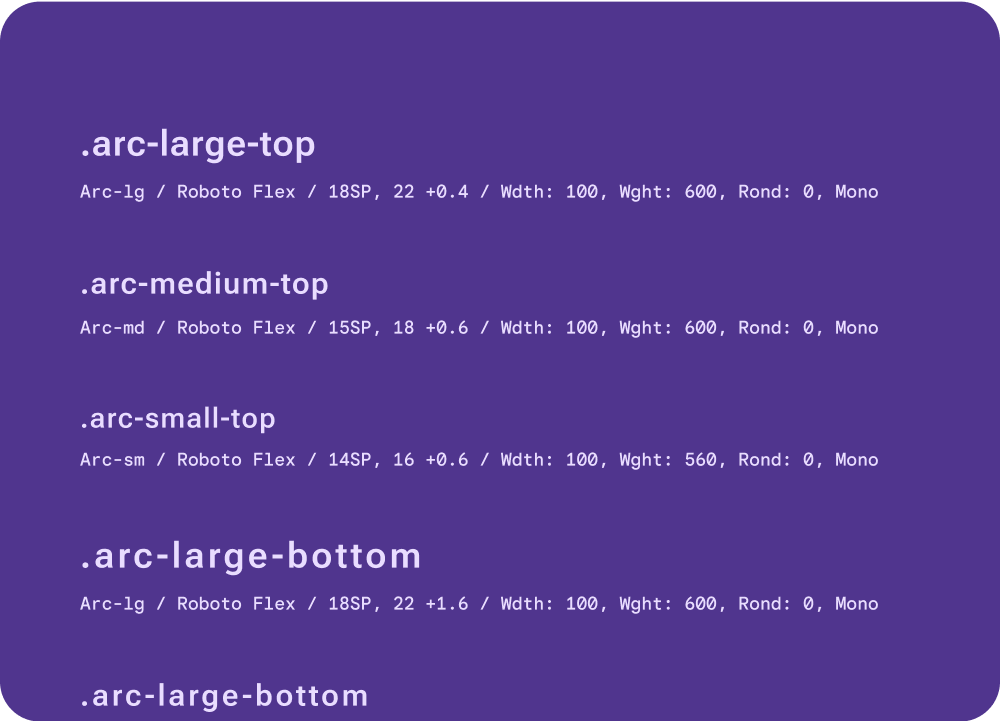 Arc header text is used for curved text making up the signposting on the UI such as time text and a curved labels. Tailored font axis that specifically optimize type along a curve and in order to accommodate the different spacing that appears between characters when they're positioned on the top, instead of the bottom, of a curved screen.