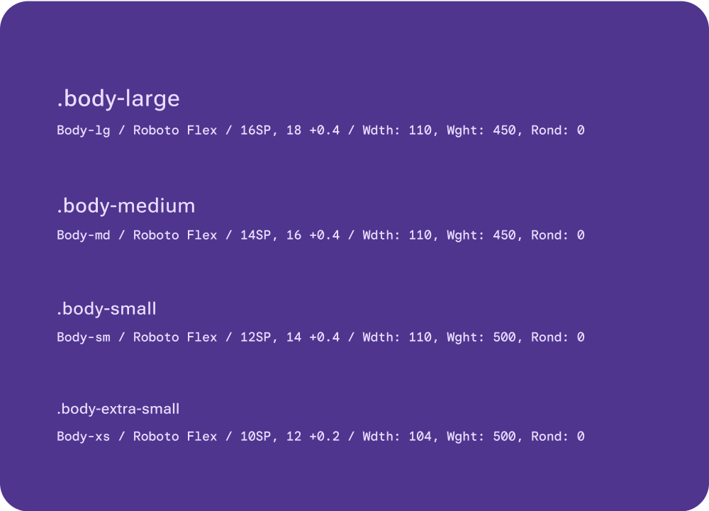 Body is reserved for content text like paragraphs of body copy, text used in complex data visualization, time stamps, and metadata.