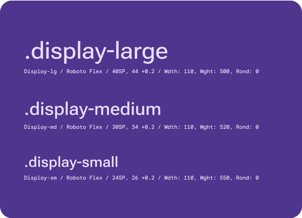 The Material 3 Expressive type scale features a combination of 21 styles, each with an intended application and meaning. They're assigned based on use (such as display or label), and grouped more broadly into categories based on scale (such as large or small). The default type scale for Material 3 Expressive is Roboto Flex, which creates a cohesive typography experience.