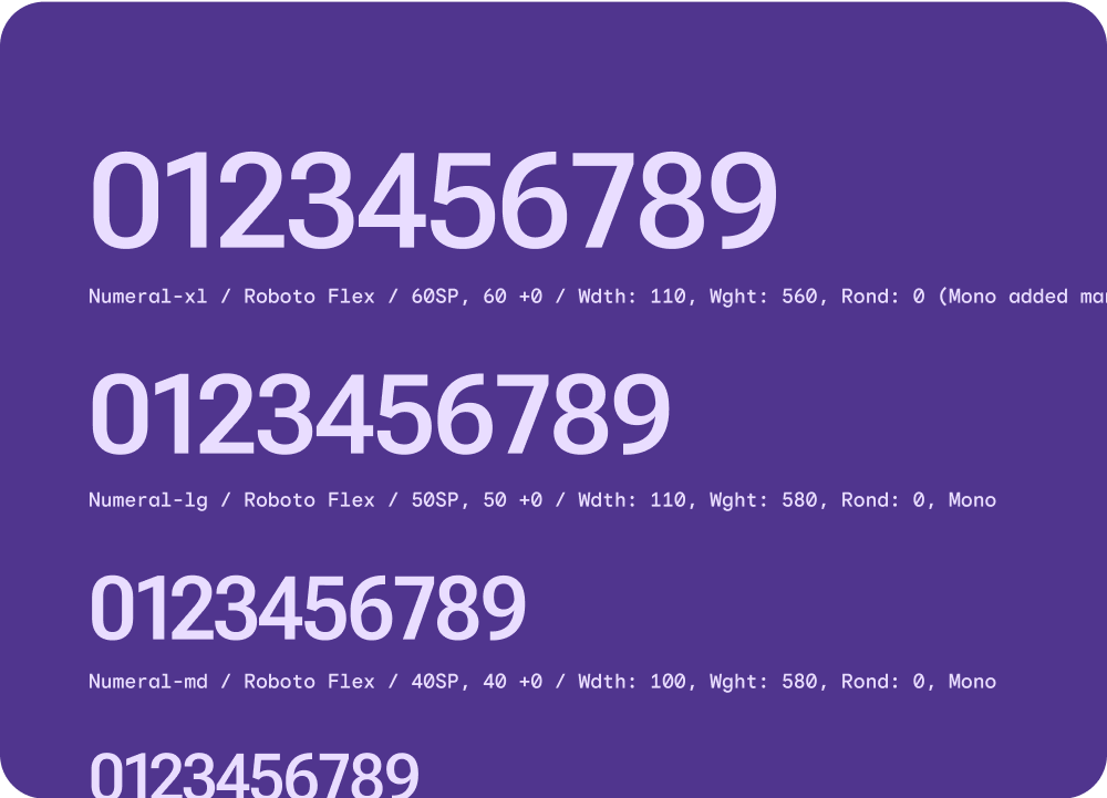 Numeral text styles are used for numerical digits, usually limited to a few characters. Can take on more expressive properties at the larger display sizes. Gives flexibility to expand width axis with minimal localization and font scaling concerns.