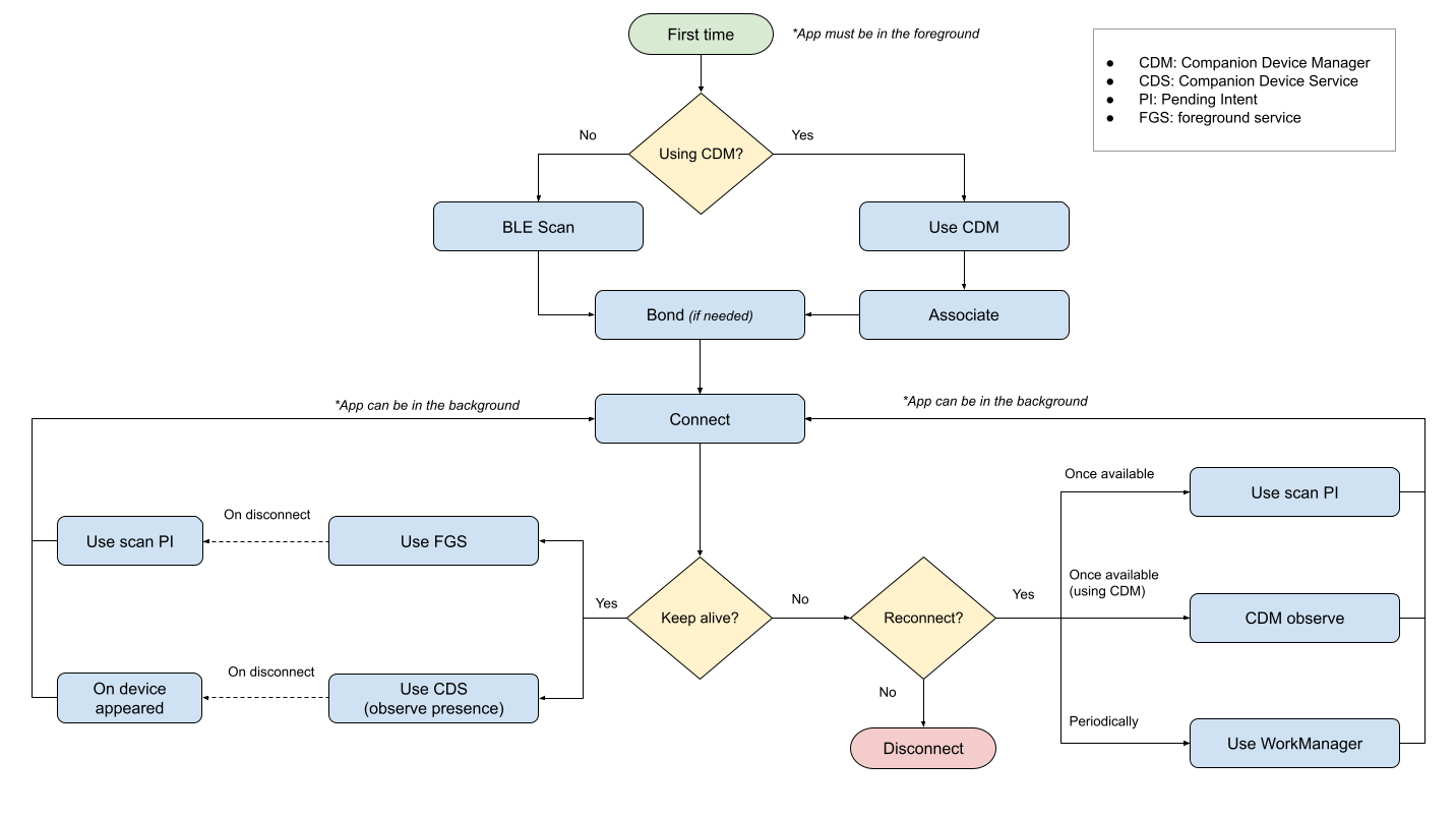 BluetoothLeScanneras described in Find BLE devices. (Sample)CompanionDeviceManageras described in Companion device pairing. (Sample)
