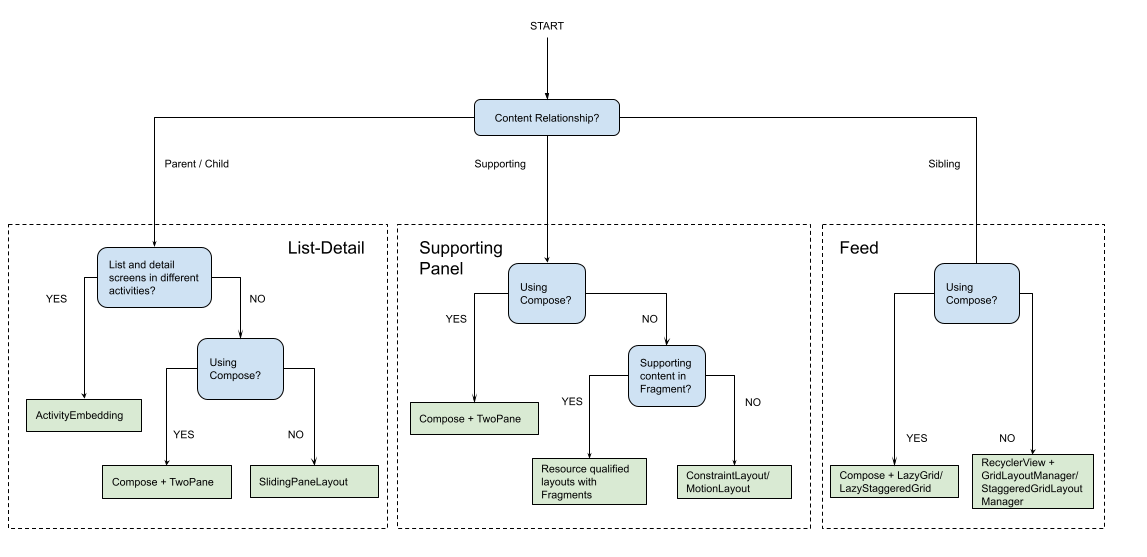 The canonical layouts create multifaceted presentations of content for easy access and deep exploration. Use the following flowchart to determine which layout and implementation strategy is best for your app's use cases.