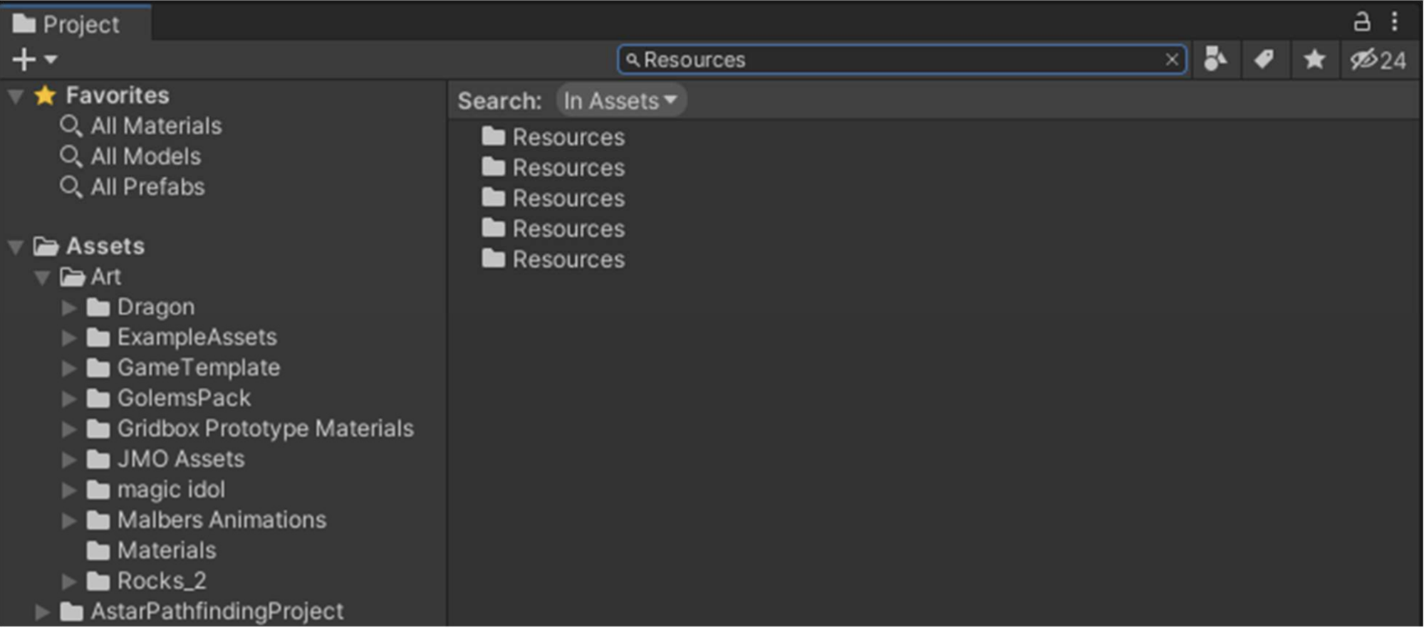 To quickly locate all resources folders, search for Resources in the Project panel. You can then select each one to identify what it contains and whether it is necessary for your game.