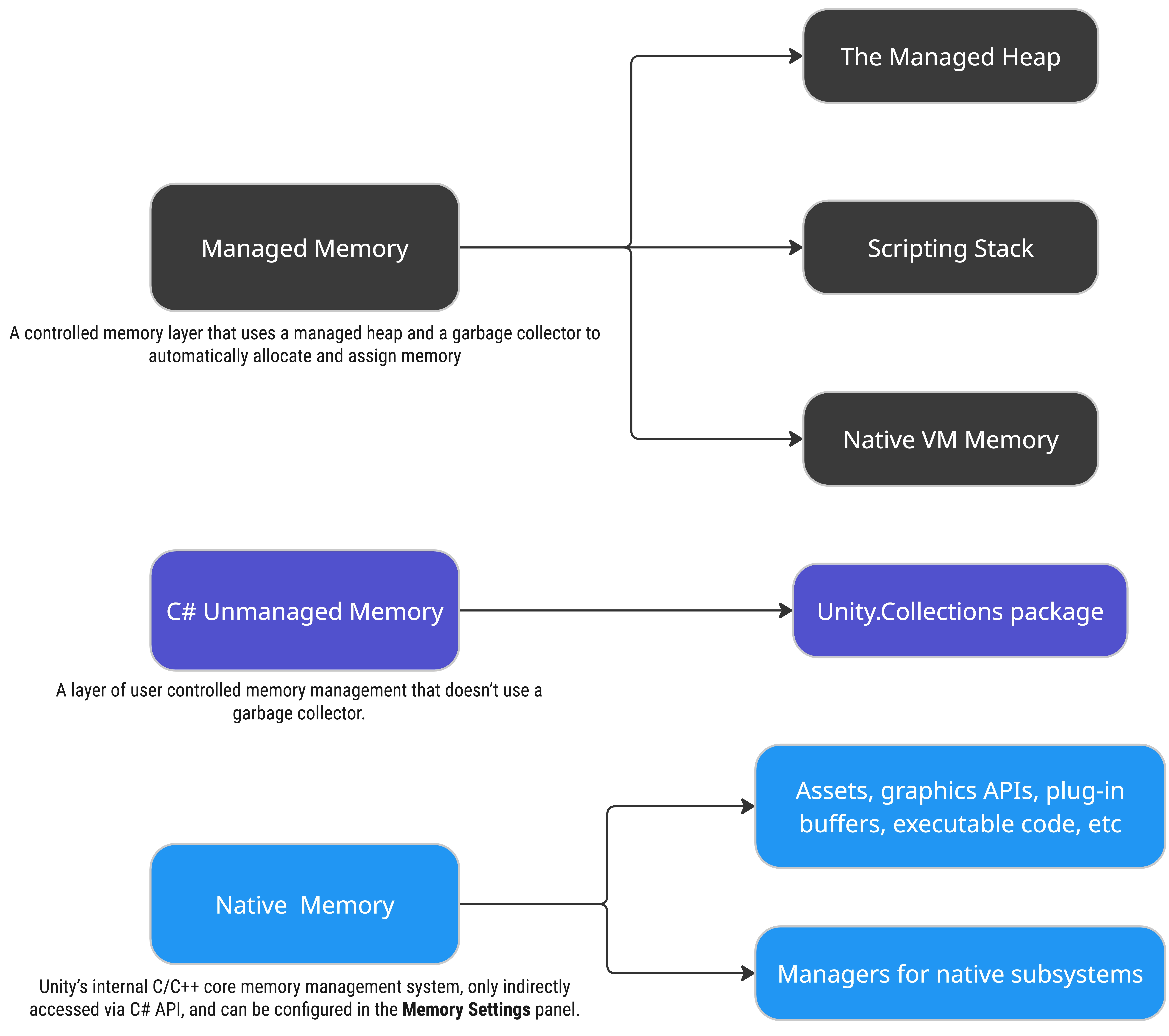 Unity's memory management implements a controlled memory layer that uses a managed heap and a garbage collector to allocate and assign memory automatically. The managed memory system is a C# scripting environment based on Mono or IL2CPP. The benefit of the managed memory system is that it utilizes a garbage collector to automatically free memory allocations.
