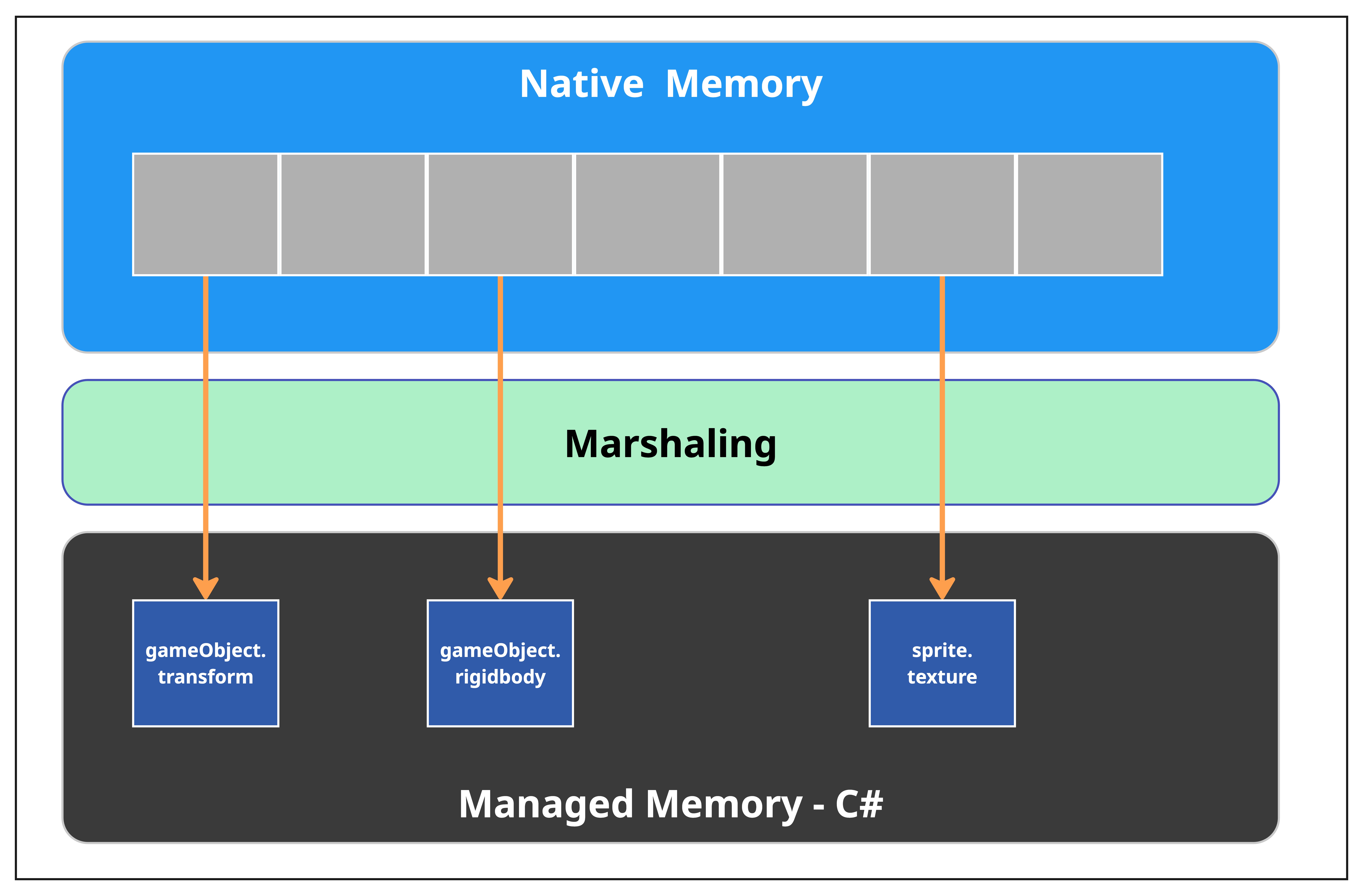 For the managed game's code (C#) to access the engine's native memory data, for instance, a call to GameObject.transform makes a native call to access memory data in the native area and then returns values to C# using Bindings. Bindings ensure proper calling conventions for each platform and handle automatic marshalling of managed types into their native equivalents.
