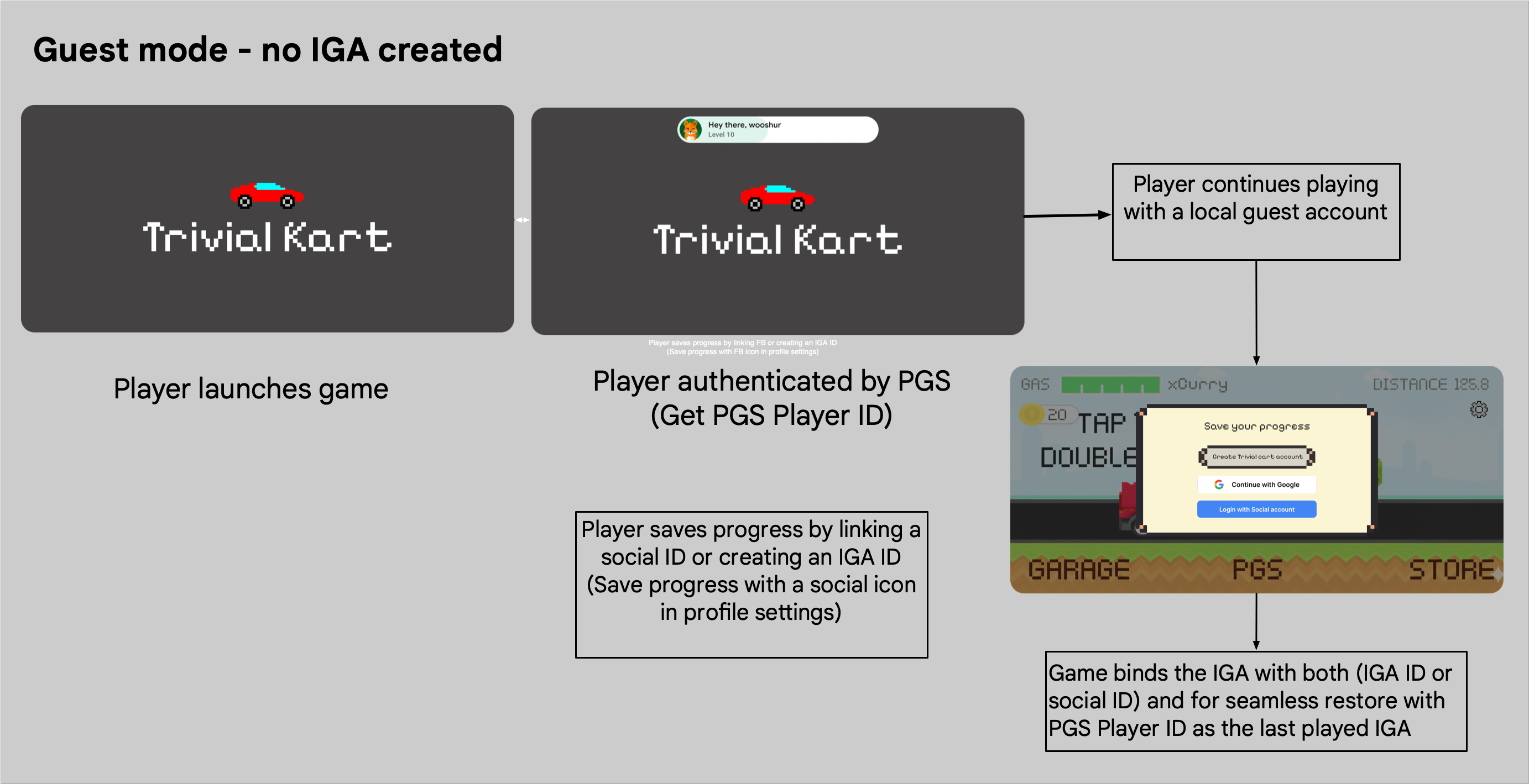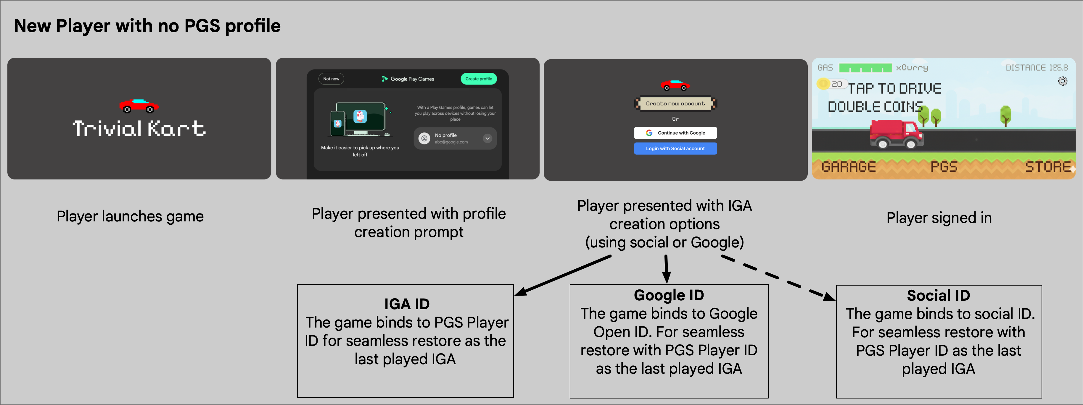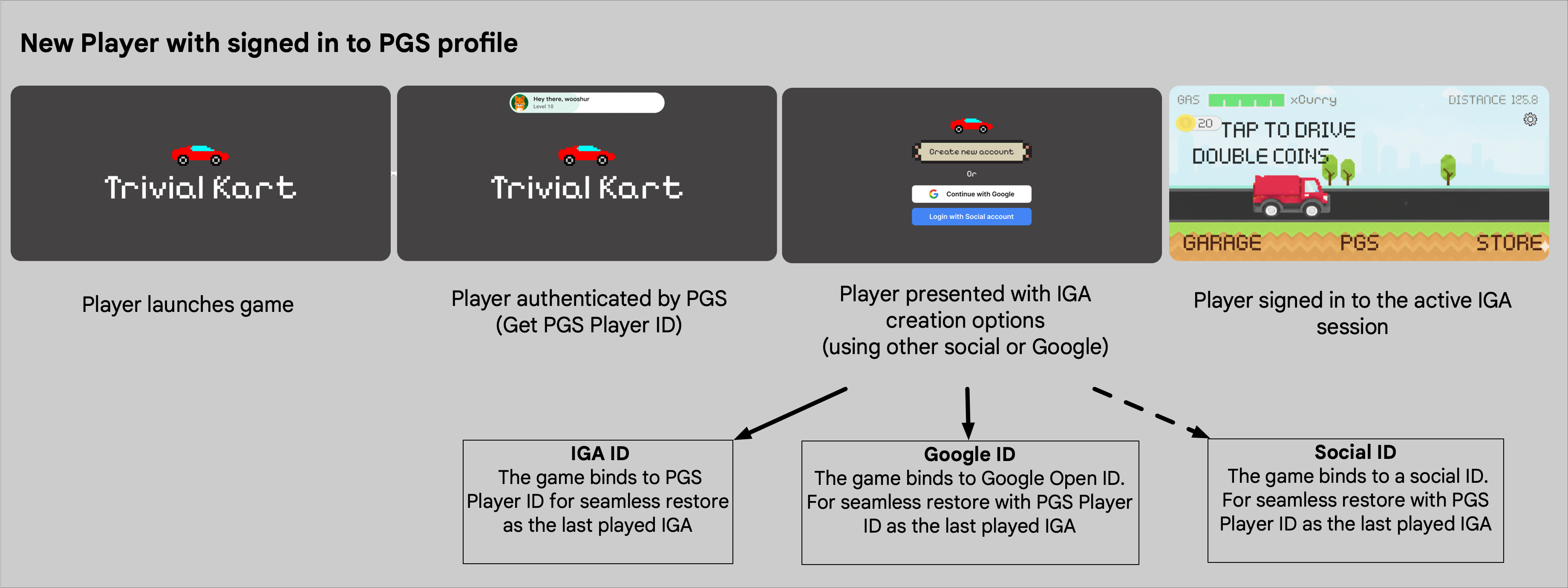 - The game then binds this IGA with PGS player ID as the last played IGA for seamless restore.