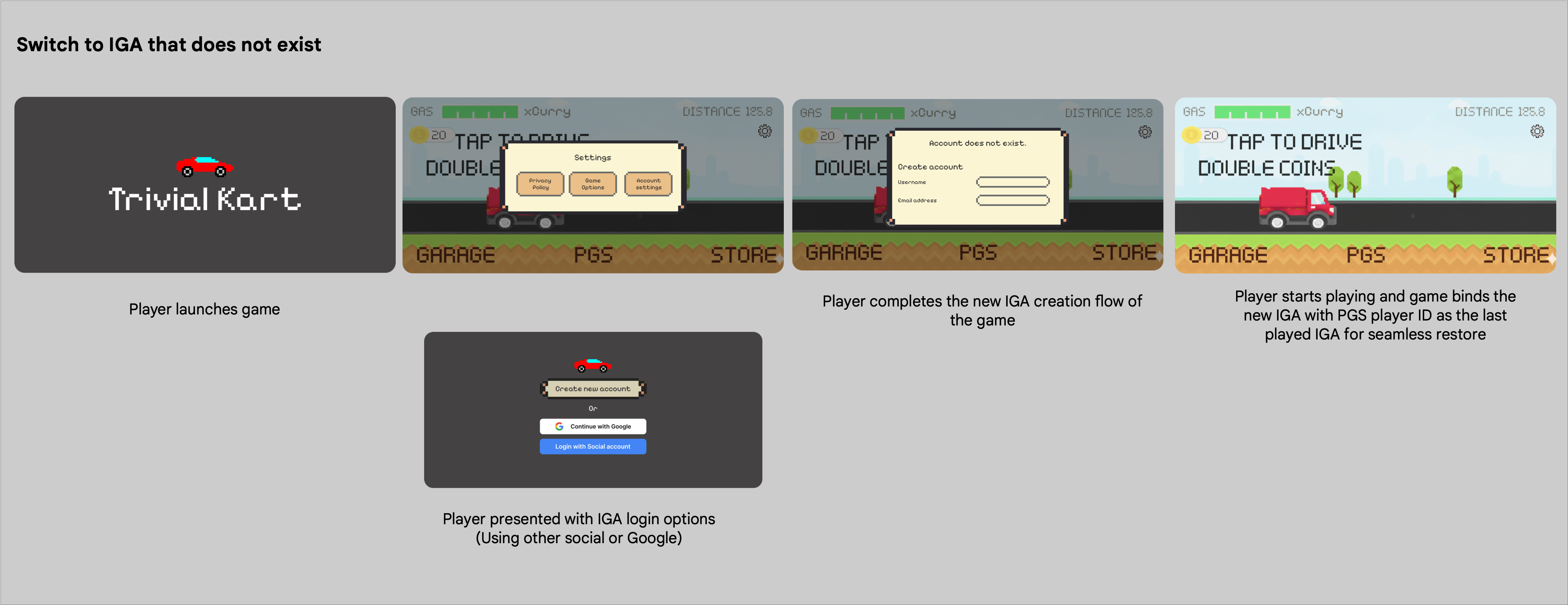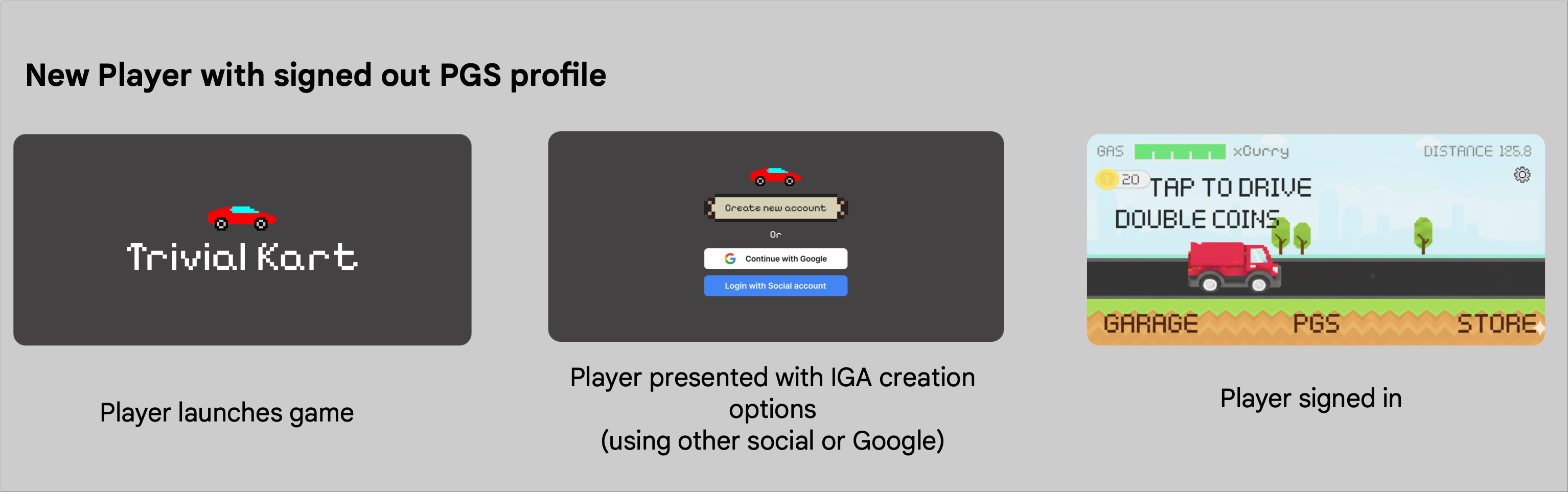 - After this background handshake, the game displays IGA creation options to the player, for example, Create new account, Sign in with Google, or other social login methods.