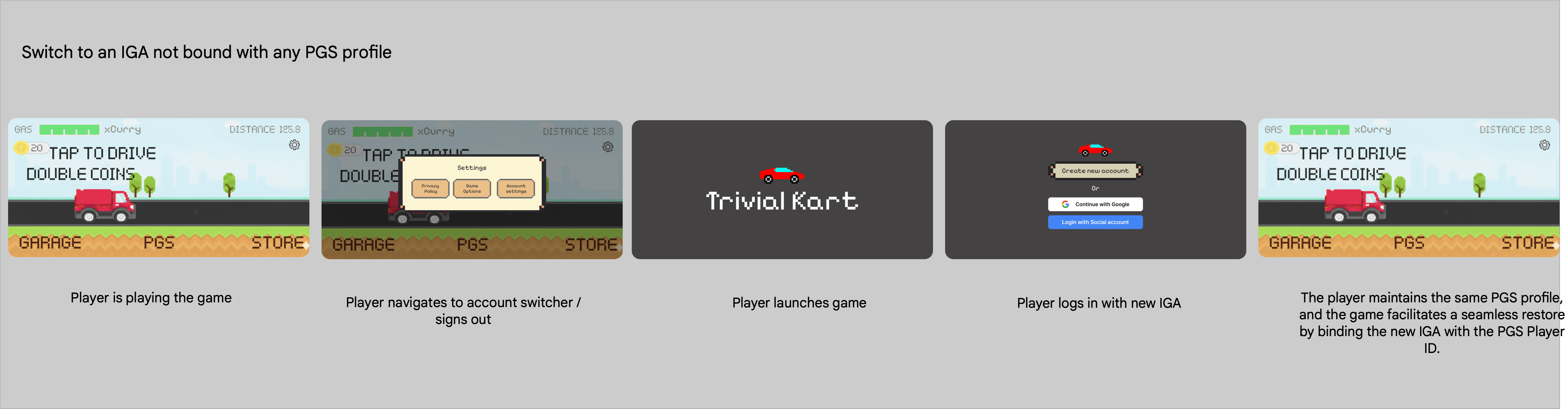 - When the player logs in with a different IGA, the game binds this new account to the current PGS Player ID as the last played IGA only for seamless restore.