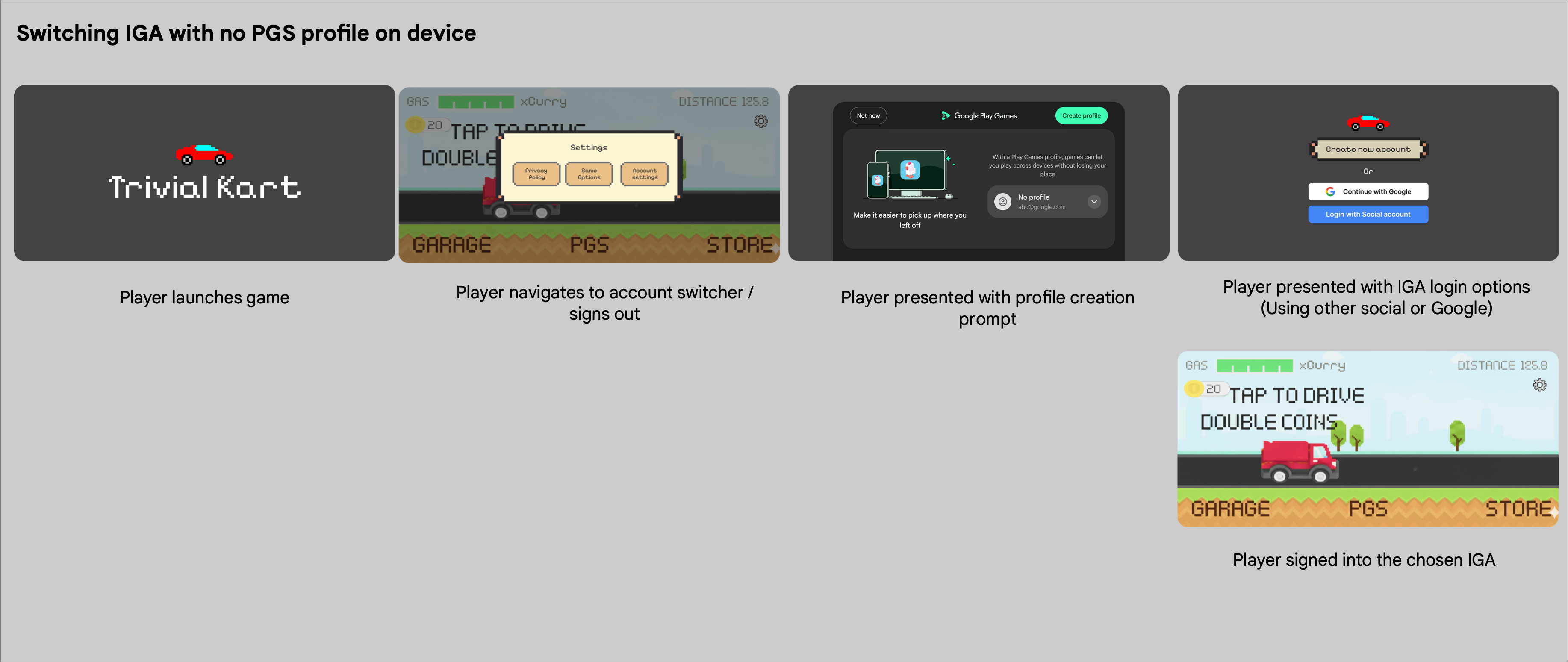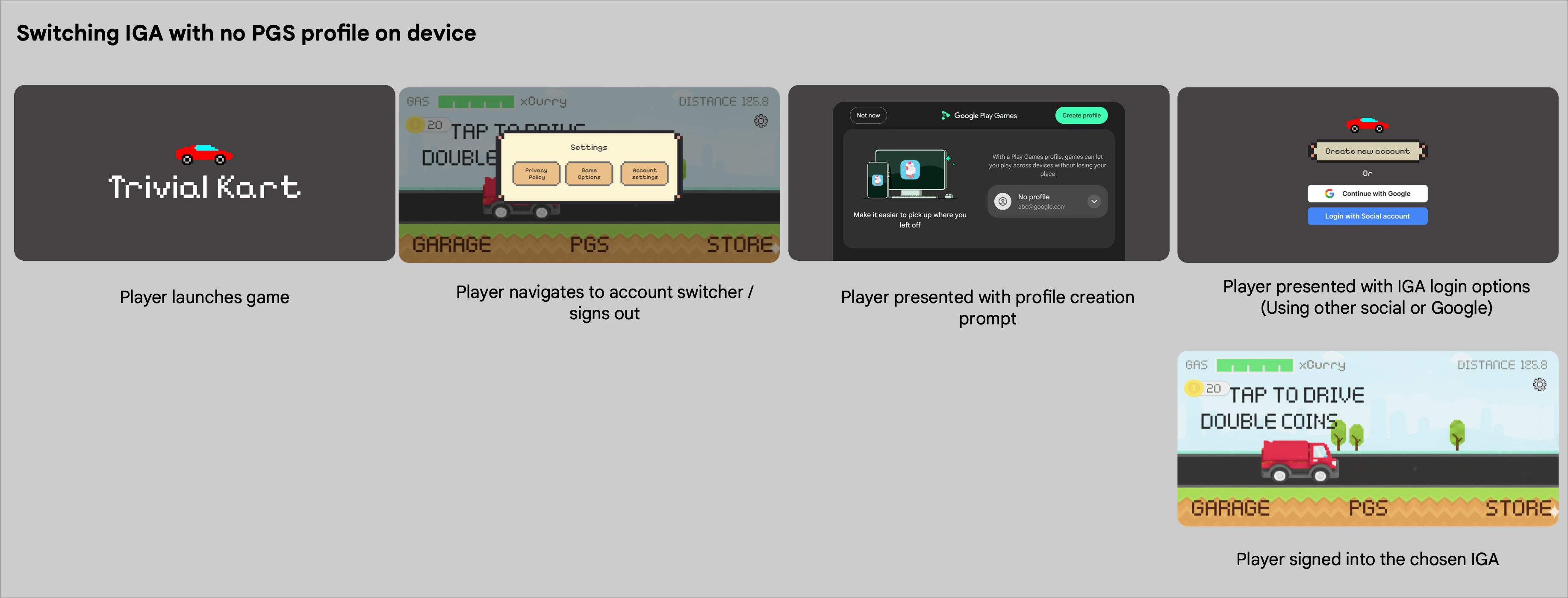 - Management of multiple IGAs: Play Games Services handles only platform authentication. Your game manages the primary authentication of players into their IGAs. This means there is no change to your game's existing flows for players to switch between their IGAs. When players switch accounts, they remain authenticated to the Play Games platform through PGS, and you continue sending their data related to achievements and other PGS features against the persistent Player ID.