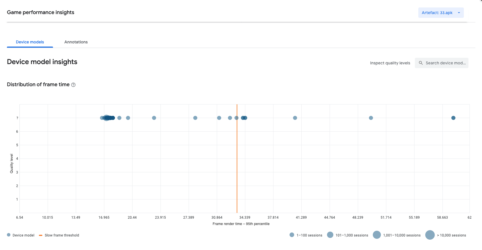 Open the Google Play Console and select the test application. Select Android Vitals > Performance > Insights to see the frame time graph.