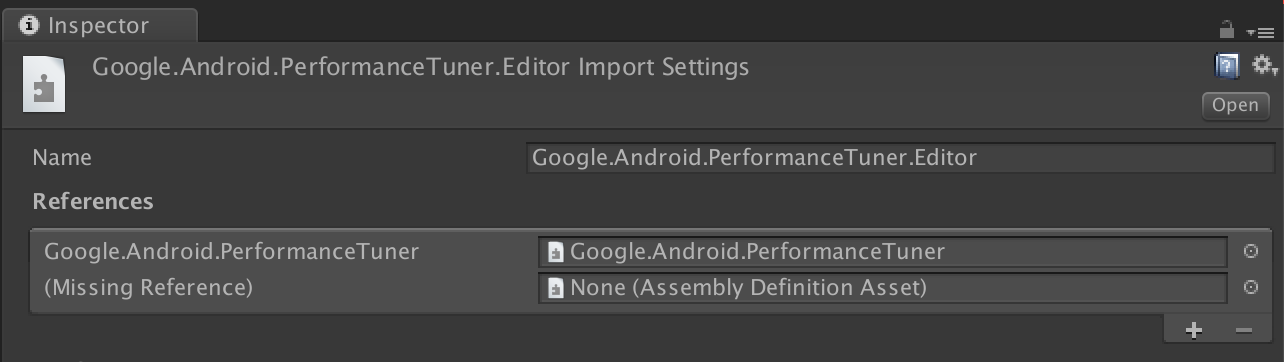 Figure 1. Missing assembly reference.Go to the Assets/AndroidPerformanceTuner/Runtime folder.