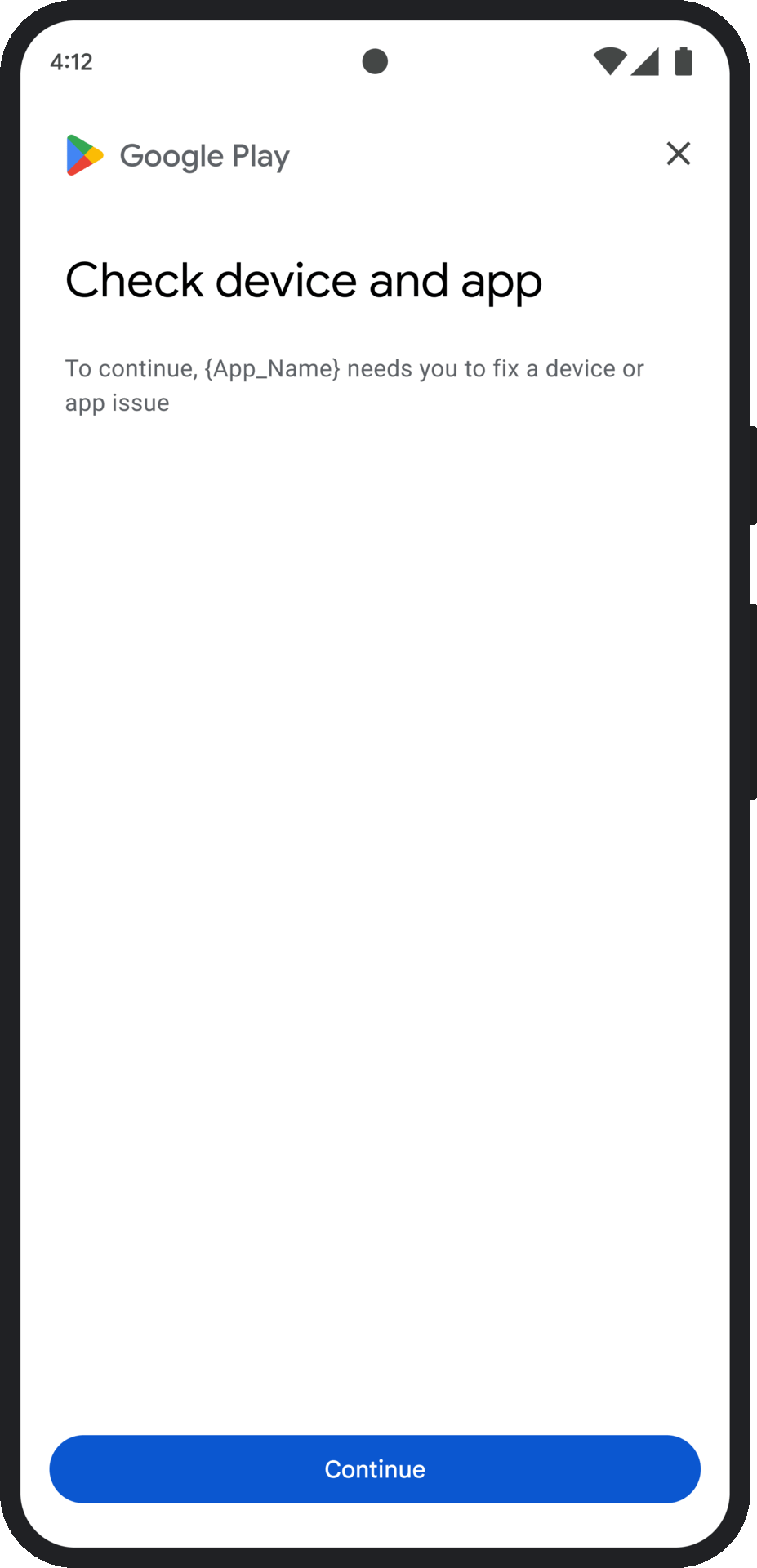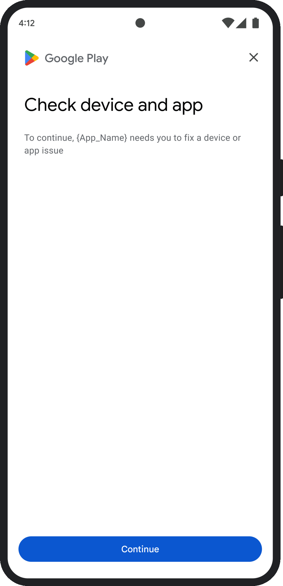 App integrity: If issues like unauthorized access or app tampering are detected, the dialog will prompt the user to acquire the app from the Play Store to fix the problem.