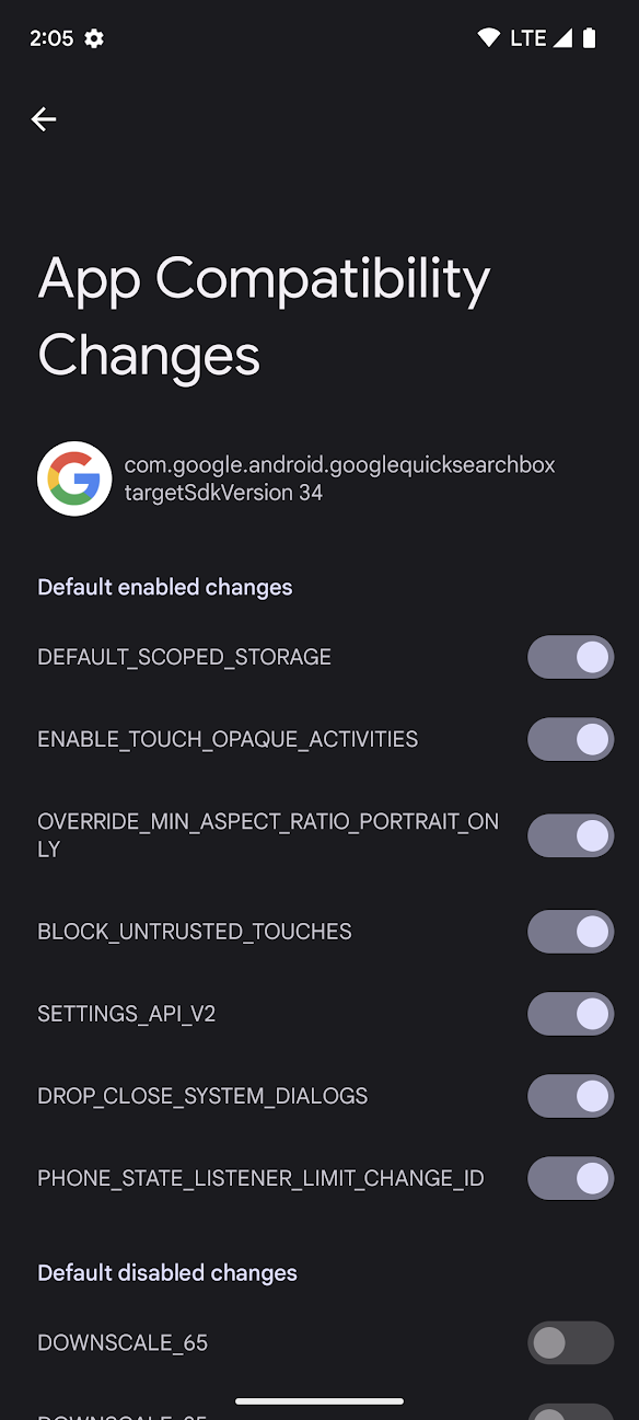 You'll also notice a section in figure 1 called Default Disabled Changes. Changes that fall into this section can serve a variety of purposes. Before enabling these changes, read the change description in the compatibility framework list for that Android version.