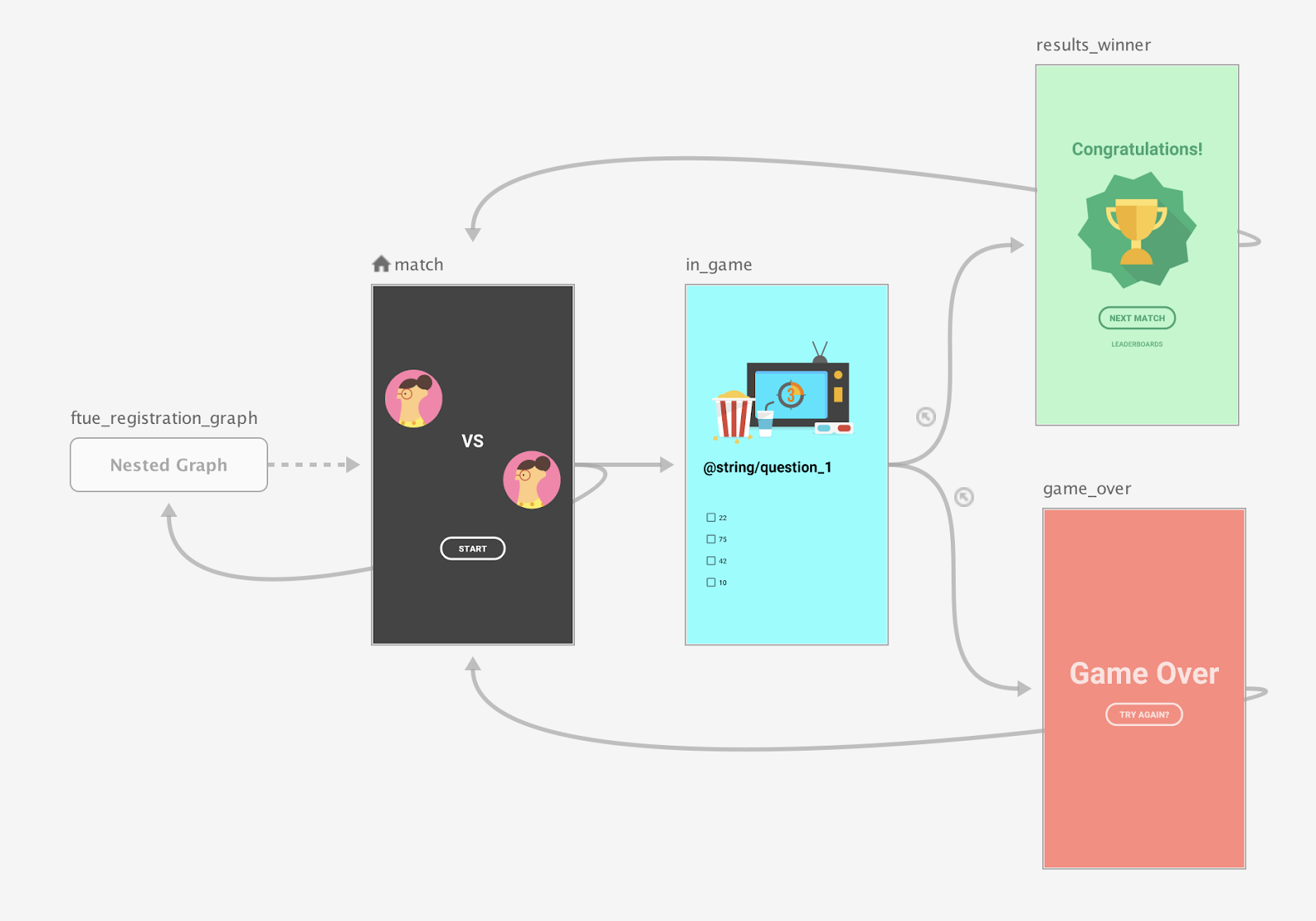As a best practice, set the match screen as the start destination of the top-level navigation graph and move the title and register screens into a nested graph, as shown in figure 1: