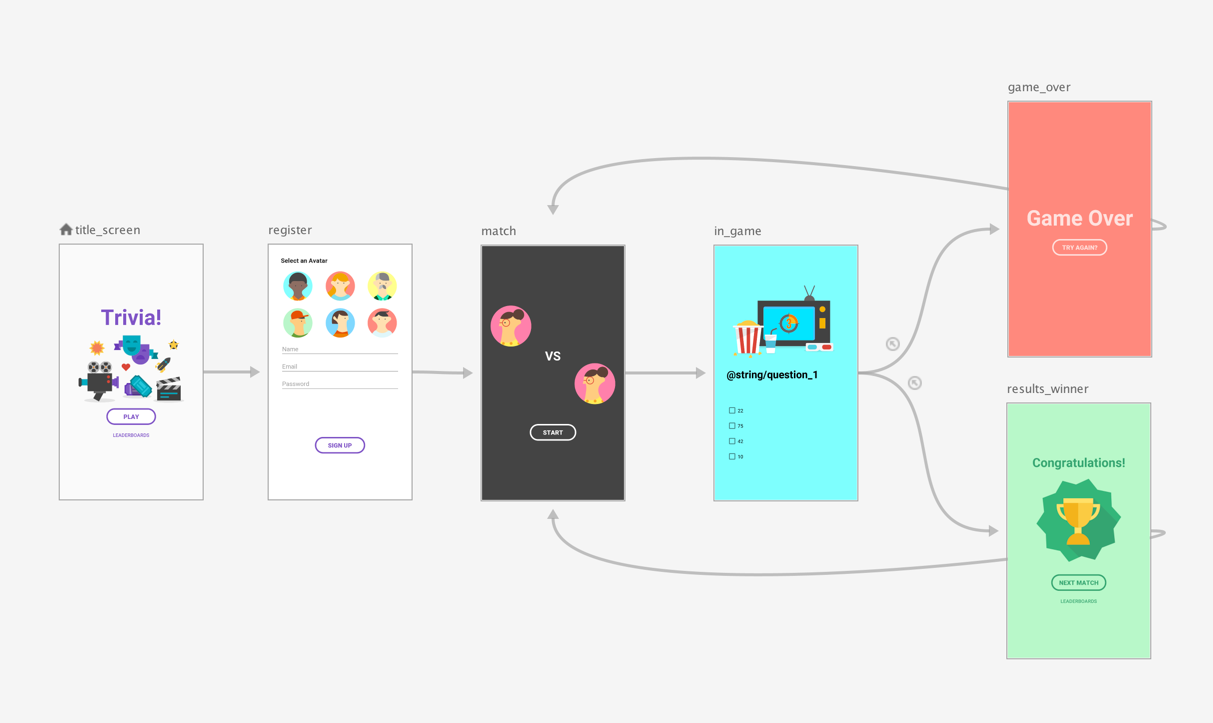 Using the top-level navigation graph from figure 1 as an example, suppose you wanted to require the user to see the title_screen and register screens only when the app launches for the first time. Afterwards, the user information is stored, and in subsequent launches of the app, you should take them straight to the match screen.