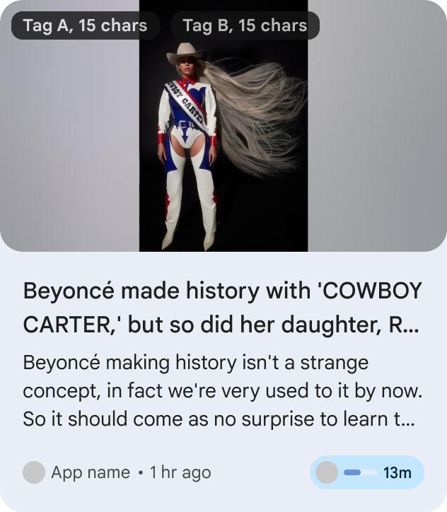 Figure 1: UI showing a single ArticleEntity within Recommendations cluster. EventEntity: EventEntity represents an event happening in the future. Event start time is a critical piece of information that needs to be conveyed to the users.
