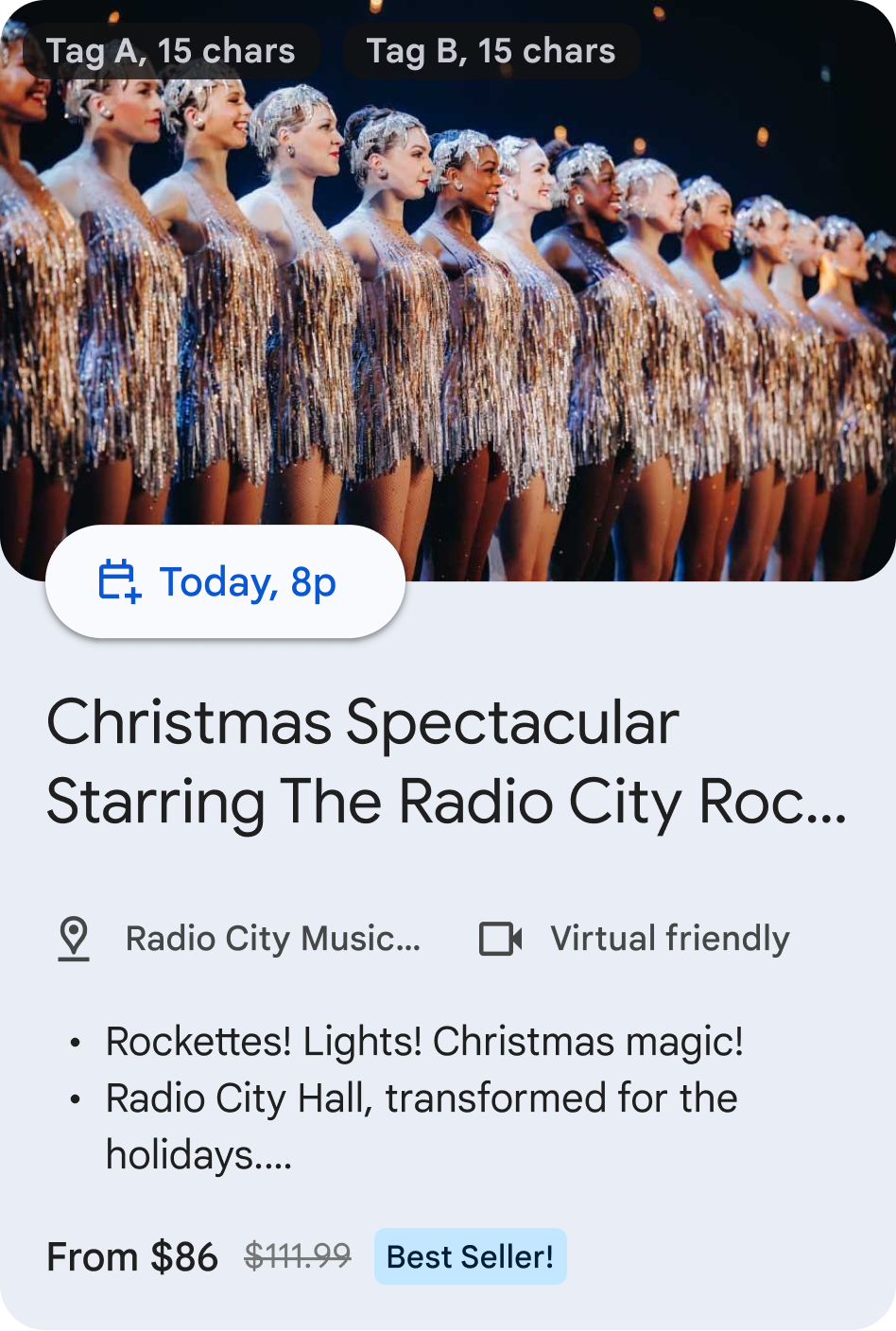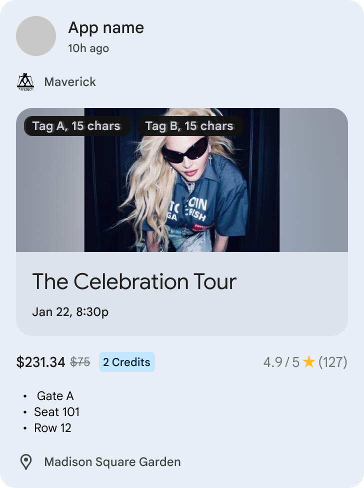 | Poster images | Optional | We will show only 1 image when multiple images are provided. Recommended aspect ratio is 16:9 Note: Image is highly recommended. If a badge is provided, ensure safe space of 24 dps at both the top and bottom of the image |