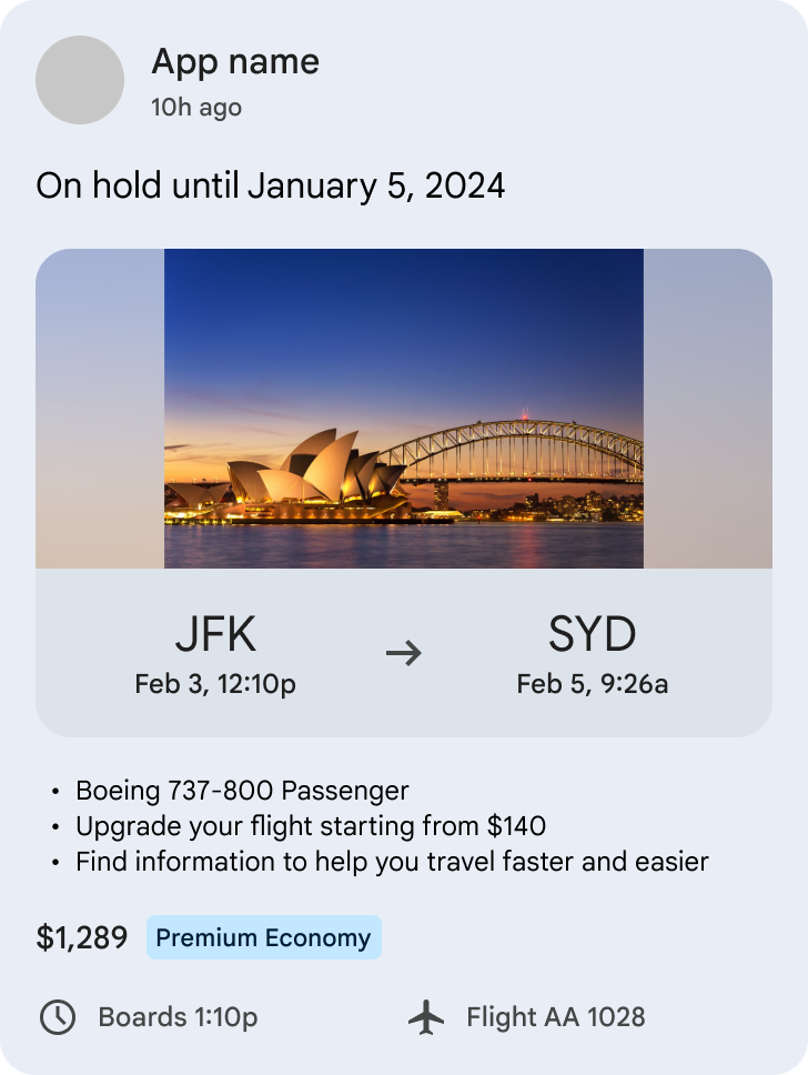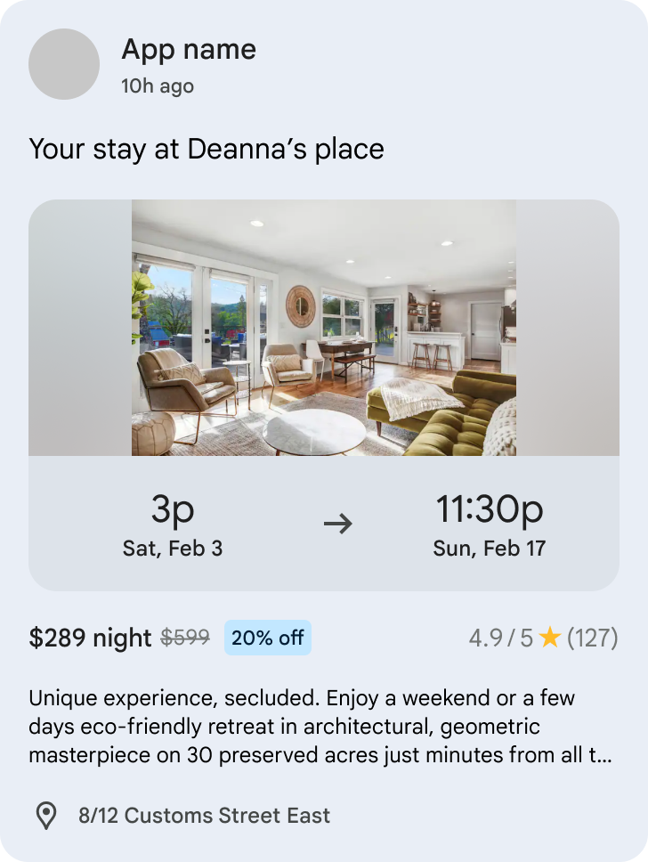 Figure 9. UI showing a single LodgingReservationEntity within a Continuation cluster. TransportationReservationEntity: TransportationReservationEntity represents a reservation for transportation by any mode and helps users track reservations for upcoming or ongoing flight, ferry, train, bus, ride-hailing, or cruise.