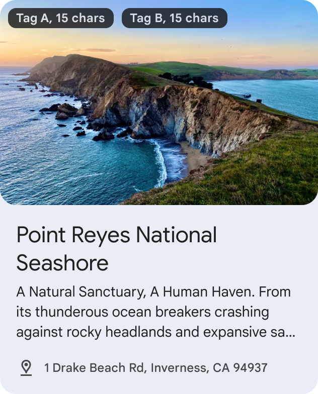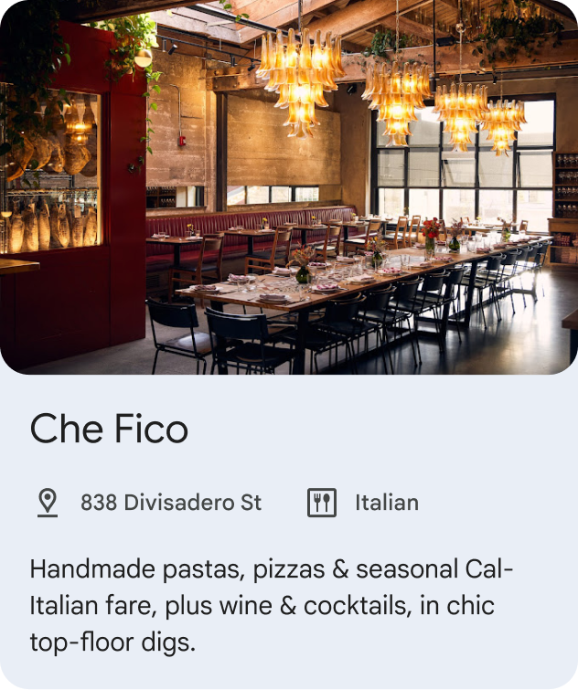 Figure 3: UI showing a single LodgingEntity within Recommendations cluster. StoreEntity: StoreEntity represents a store, restaurant, cafe etc. It highlights content where a dining venue or store is the critical piece of information that needs to be conveyed to the users.