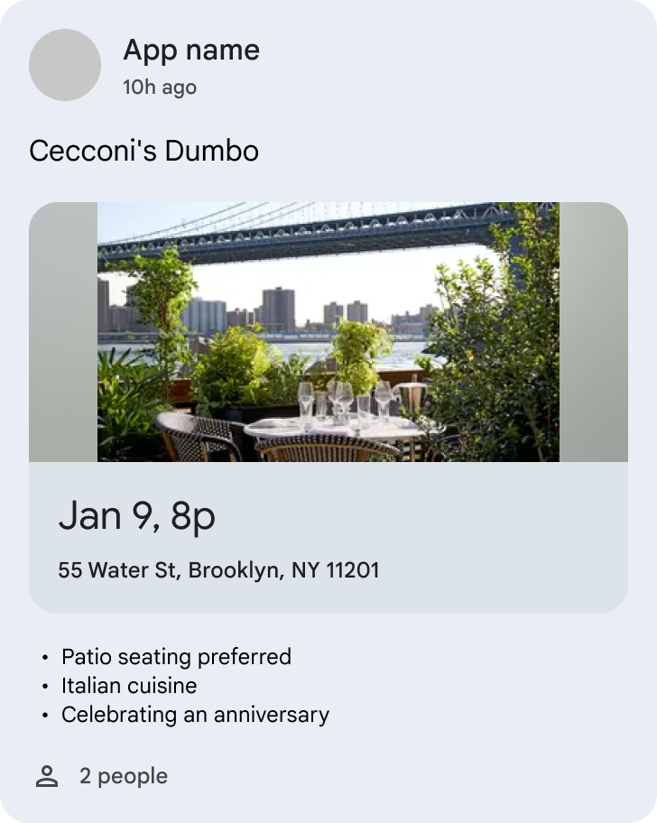 Figure 7. UI showing a single RestaurantReservationEntity within a Continuation cluster. EventReservationEntity: EventReservationEntity represents a reservation for an event and helps users track upcoming or ongoing events reservations. Events could include, but not limited to the following: