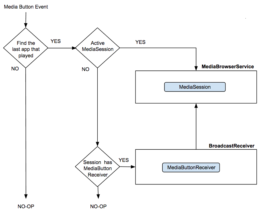If you are running Android 8.0 (API level 26) or later, the system tries to find the last app with a MediaSession that played audio locally. If the session is still active Android sends the event directly to it. Otherwise, if the session is not active and it has a mediabutton receiver, Android sends the event to the receiver, which will restart the session and so it can receive the event. (See Using media buttons to restart an inactive media session for details.) If the session does not have a media button receiver the system discards the media button event and nothing will happen. The logic is shown in the following diagram:
