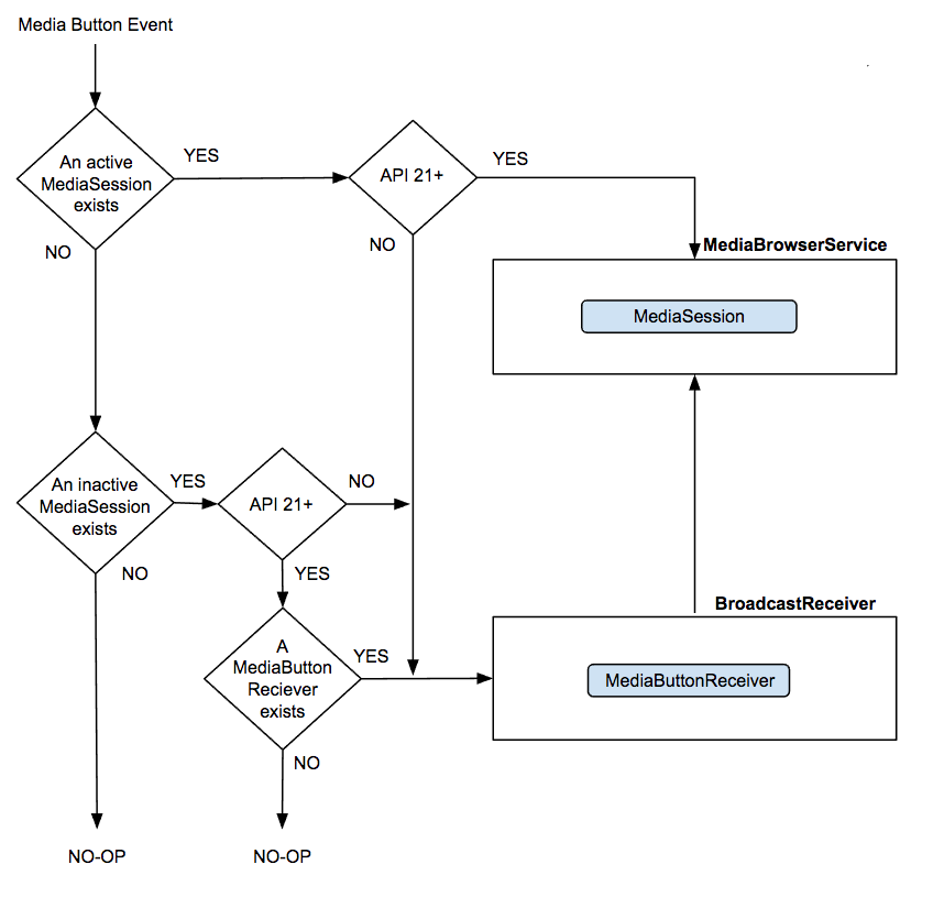 FLAG_HANDLES_MEDIA_BUTTONSMediaBrowserCompat.ConnectionCallback.onConnected. This will automatically call your media controller'sdispatchMediaButtonEvent(), which translates the key code to a media session callback. - Prior to Android 5.0 (API level 21), you need to modify