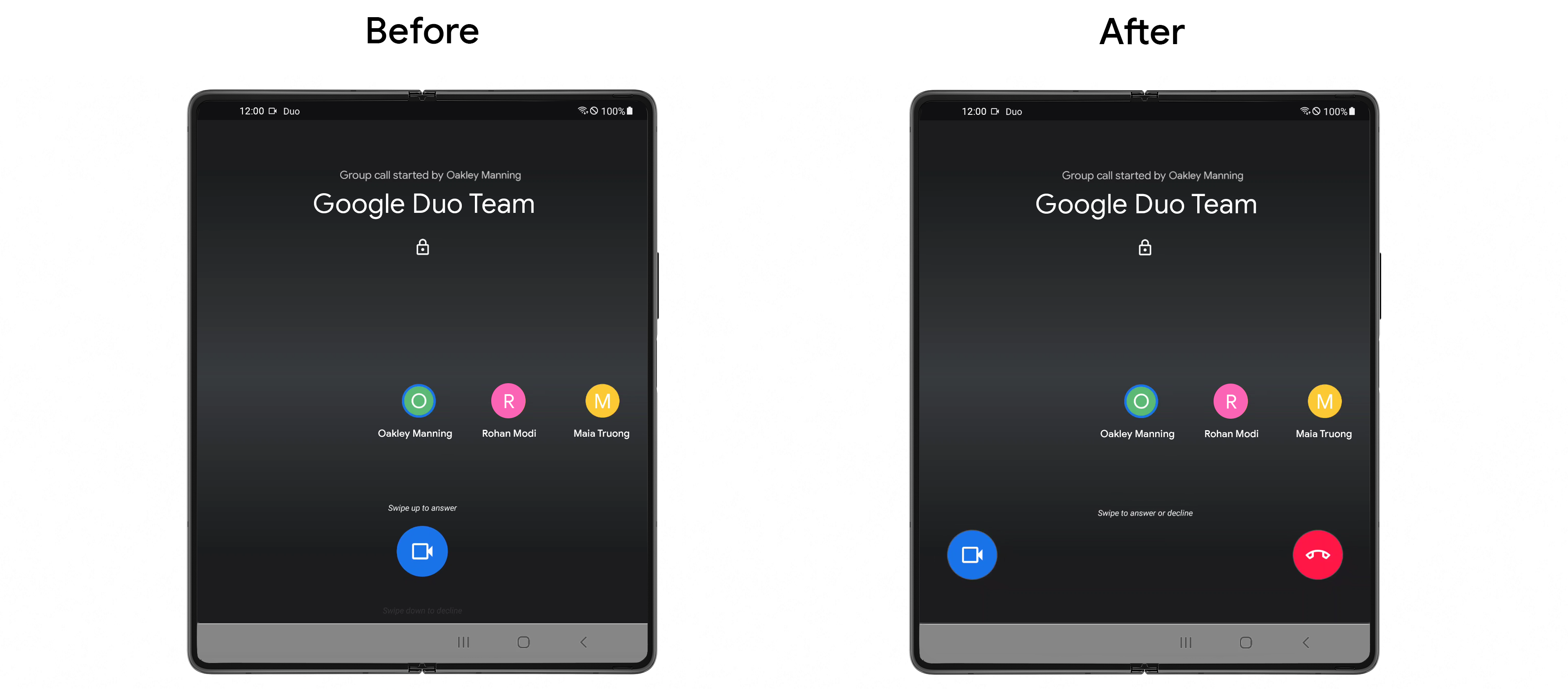 After this, the team thought about user interactions with Duo across all screen sizes. While swiping to answer a call works really well on a phone, the development team learned through testing that this didn’t work as well on a tablet or foldable. Some Duo users were unintentionally answering phone calls and having to hang up quickly. The team optimized the larger screen experience by implementing buttons on tablets, and dual sliding pucks on foldables.The team was closely monitoring behavior changes as part of this UI improvement, and saw a decrease in unintentional brief calls on these devices, as well as an increase in call time on these devices. This UI tweak enabled Duo’s users to have a more seamless calling experience.