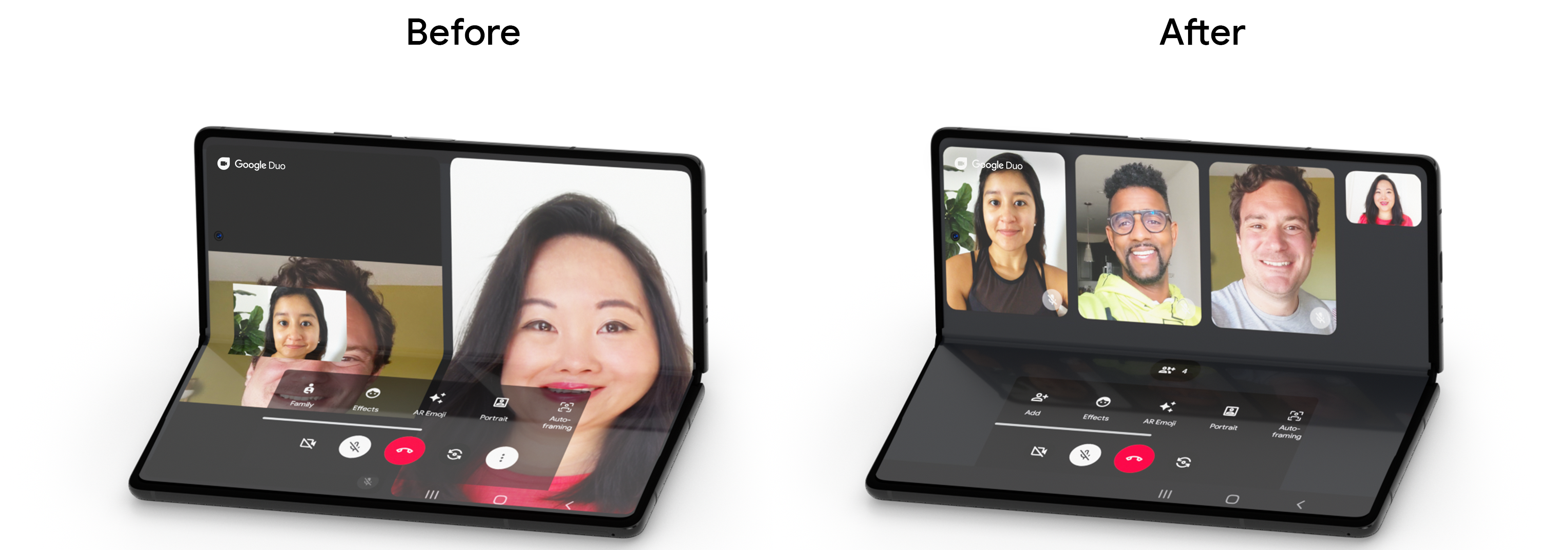 Google Duo is a simple, high quality video calling app for everyone. With the increase of people being at home during the Covid-19 pandemic, the Duo team saw a significant increase in people using the app to stay connected with friends & family, school and work. The team strives to build great experiences across all platforms and surfaces, and saw an opportunity to improve the experience for tablets and foldable devices given the huge growth of these devices in the market, and the prevalence of them amongst Duo users.
