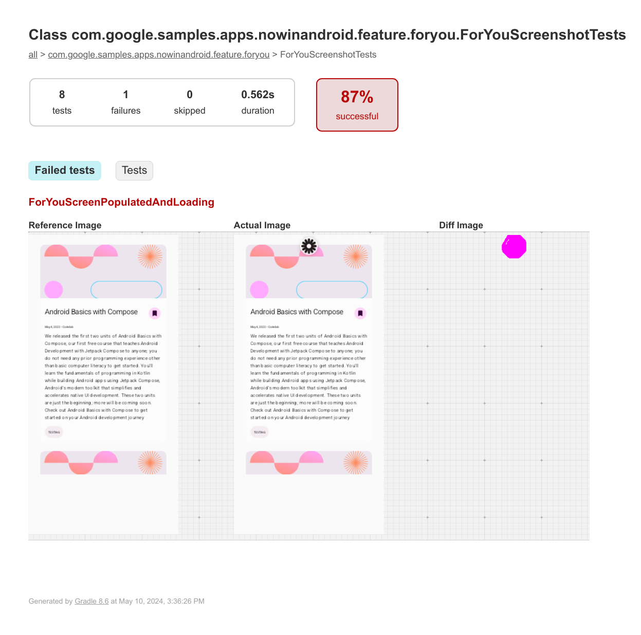 Once the reference images exist, generate a test report by following the instructions below for the IDE integration or for the Gradle tasks.