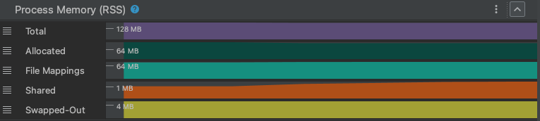 • Total: This is the total amount of physical memory in use by your process. On Unix-based systems, this is known as the "Resident Set Size", and is the combination of all the memory used by anonymous allocations, file mappings, and shared memory allocations.