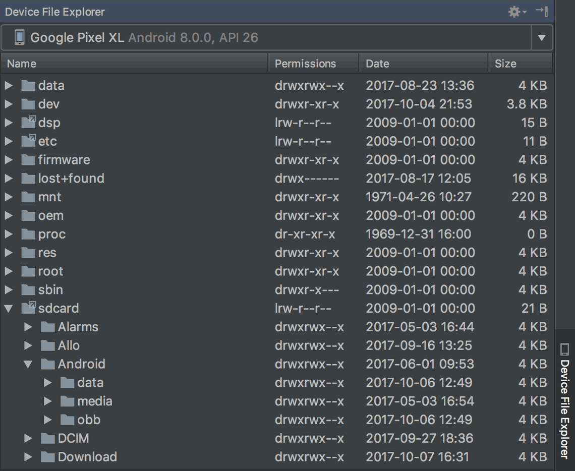 The new Device File Explorer allows you to inspect your connected device's filesystem, and transfer files between the device and your computer. This replaces the filesystem tool available in DDMS.