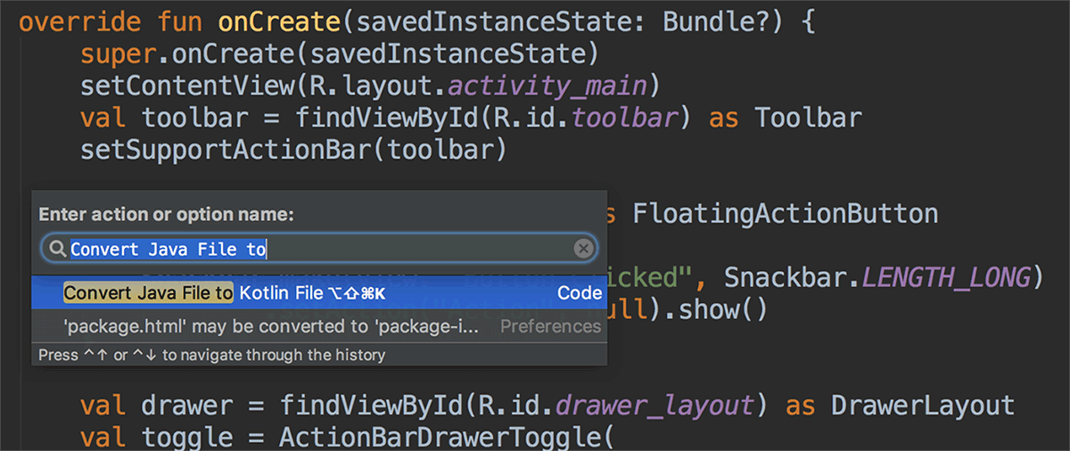 You can incorporate Kotlin into your project by converting a Java file to Kotlin (click Code > Convert Java File to Kotlin File) or by creating a new Kotlin- enabled project using the New Project wizard.