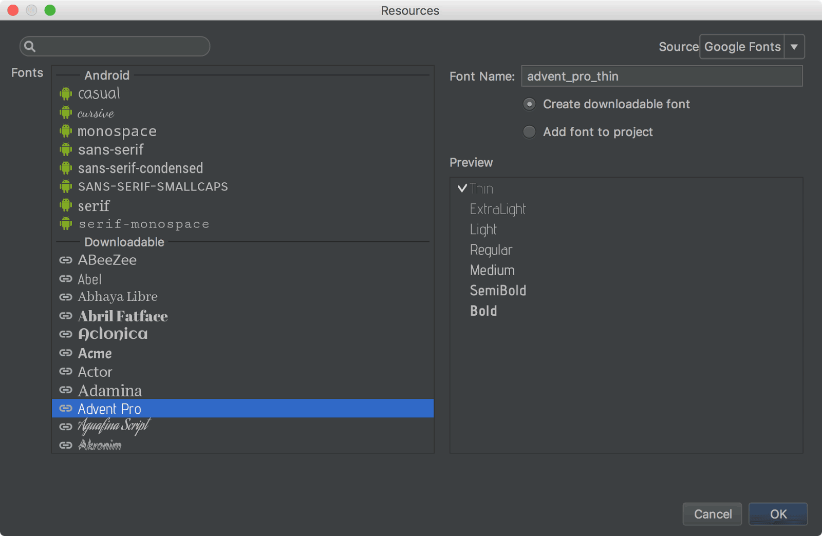 To support the new font resources in Android 8.0, Android Studio includes a font resources selector to help bundle fonts into your app or configure your project to download the fonts on the device (when available). The layout editor can also preview the fonts in your layout.