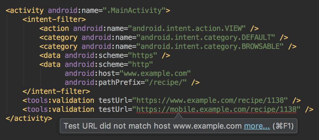 If any one of the test URLs does not pass the intent filter definition, a lint error appears. Such an error still allows you to build debug variants, but it will break your release builds.